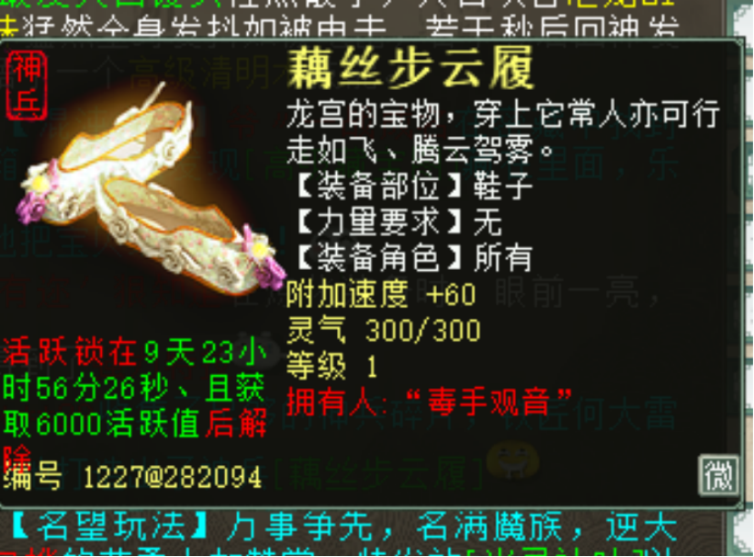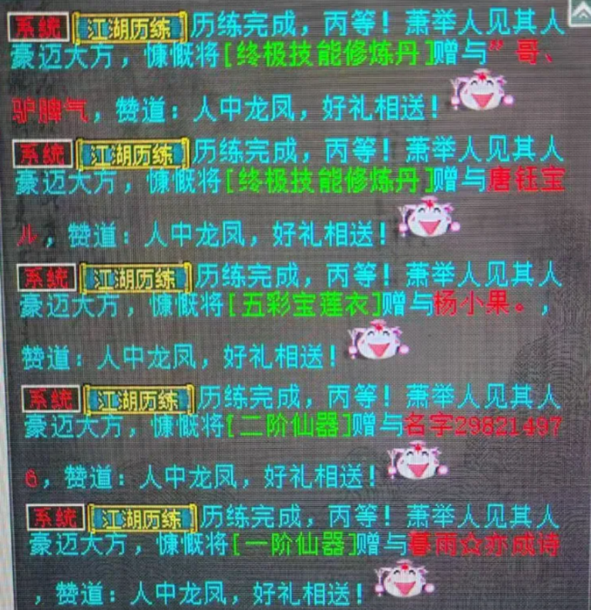 这把顶级六阶仙器售价8.5万,难道说要出7阶了?大话江湖从来不乏高手与土豪,近日“夜店小欢虎”也搞出大手笔动作!剧本都不敢写的几率,这也太夸张了吧?三百环奖励继续,居然没有六魂和丸子?园子领悟技能,还剩几分钟要出了,喊一嗓子看看能如愿否? 老铁们好!今天的大话新鲜事栏目准时奉上,一起来欣赏其中的精彩内容吧! 一、无属性6阶仙器,仅仅只卖8.5万? 一把男人无属性六阶仙器,售价仅仅为8.5万,而两年前白板6阶仙器的价格都高达9万多,这类带无属性特技的更是贵得夸张,按照走向来看,莫非真的要出7阶仙器了? 售价信息 六阶忽视混睡仙器,蓝字忽视睡0.2,炼器忽视混3,特技无属性要求,放在之前的话,这把仙器怎么也要在20万以上了吧? 二、夜店小欢虎大手笔搞事,问号年重修中! 近日,神豪“夜店小欢虎”给自己的终极神兽年重修技能,目标直指化无,咱们来看看这波结果如何! 年来化无 问号年 以牙还牙 最终修出了终极技能“以牙还牙”,对于一线队伍来说,以牙基本可以当化无来用了,而目前化无年的价格在90万区间,如果再继续重修的话,还不如置换一只划算? 二、凌晨十分,剧本都不敢写的几率! 一位来自凌烟阁服务器的老铁,他在十二点前后连续收获两双藕丝,这也太夸张了吧? 神兵碎片换出藕丝 第二双藕丝 世界喊话 神兵碎片连续换出两双藕丝,真的是毒手无敌啊,剧本恐怕都不敢这么写...... 四、三百环奖励,居然没出六魂? 三百环奖励继续更新,今天这位兄弟五个号开跑,最后居然一颗六魂和丸子都没出,这是赚大的节奏啊! 系统消息 两颗终极技能修炼丹、神兵五彩宝莲衣、二阶仙器、一阶仙器,太帅了,难道是最近提升了三百环出极品的概率? 五、园子悟技能,神嘴再现! 兄弟在园子领悟技能,还剩几分钟就要出去了,最后喊一嗓子看看表哥能不能满足心愿! 系统消息 最后几分钟了,刚喊话完,就成功领悟了神出鬼没,绝对的神嘴时刻,恭喜恭喜! 今天的大话新鲜事就到这里了,感谢一战成名、国窖1573、小放肆、A小贝、一花一世界等玩家们的热心投稿,小伙伴们如果在游戏内外碰见任何有意思的事情,都可以给我们投稿哦! [编辑:093ke]