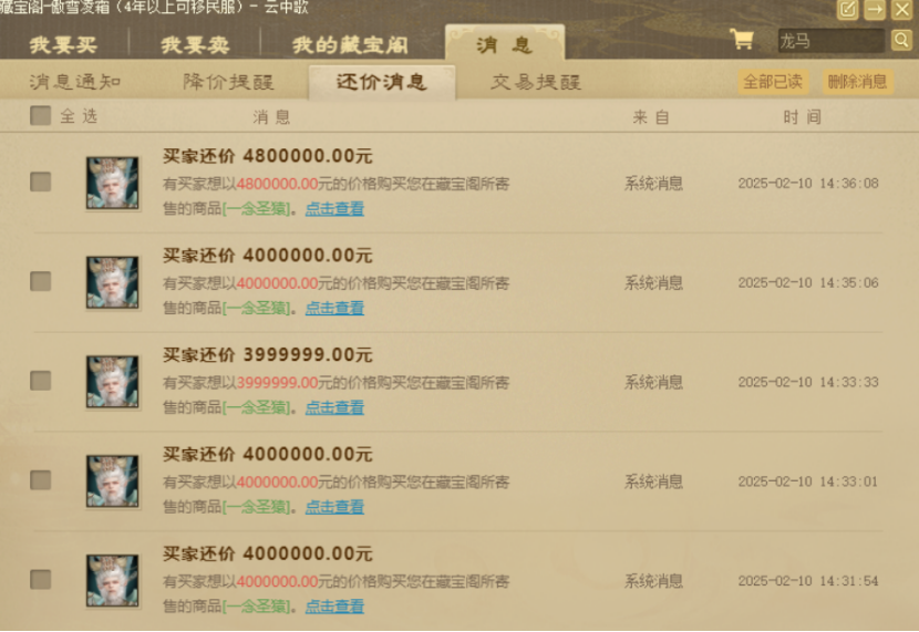 全服首只问号“一念圣猿”上架藏宝阁,售价高达500万!全服第一大力女魔易主,这又是哪位神豪回归了?老号登陆,没想到当铺还藏着一把绝版双回武器!范式之魂重修终极技能,求来化无!五开地宫换神兵,来个藕丝让我圆梦? 兄弟们好!今天的大话新鲜事栏目准时奉上,一起来欣赏其中的精彩内容吧! 一、问号圣猿500万上架! 经过神豪疯抢、大君加好友之后,全服首只问号“一念圣猿”近日已上架藏宝阁,标价高达500万,而在还价的消息中,竟有人还出480万的价格! 4999999藏宝阁 还价信息 多人想以400万的价格购买这只问号圣猿,这泼天的富贵啊,可能普通人一辈子都赚不到,不知道号主最终会以多少钱的价格出售呢? 二、全服第一大力女魔易主? 号称全服第一大力女魔的“杀死吉米”号近日易主,这又是哪位大佬回归了?咱们先来回顾下这个号的战斗表现! 人物属性 伤害展示 更换主人 站街属性14万攻击,速度1800,16星更是能砍出千万伤害,不知道更换号主后,会不会继续走大力路线,全服第一大力女魔的地位又能不能保住呢?让我们拭目以待! 三、老号登陆,竟藏绝版神兵! 回归老号登陆,没想到当铺还藏着一把绝版双回武器,如今市面上已经很难见到这样的武器,估计能值不少钱吧? 武器全貌 四级双回神兵,底子加强三尸4800、加强遗忘16、加强三尸回血程度40,蓝字强力克土26.8,炼器三尸虫狂暴几率4.3、三尸虫狂暴程度5.4,号主的ID也非常亮眼54321,光这ID就能值不少了! 四、范式之魂重修终极现场! 一只范式之魂重修终极技能,目标是奔着化无去的,一起来看看最终修出了什么? 范式之魂 当头棒喝 最后修出“当头棒喝”,老板表示后续还会继续修炼,直到修出化无为止,也希望大佬早日圆梦! 五、五开地宫换神兵! 新年五开地宫换神兵,希望来双藕丝步云履,让开年的春风更加动人一些吧! 系统消息 三件锁子黄金甲,再加混元盘金锁、多情环,看来春风动人是不可能了,天气转凉还是很有可能的,不然为啥给这么多衣服...... 今天的大话新鲜事就到这里了,感谢蚂蚁体彩竞彩、七彩太子、招财进宝、寒江孤影、霸气勇哥等玩家们的热心投稿,小伙伴们如果在游戏内外碰见任何有意思的事情,都可以给我们投稿哦! [编辑:09dkior]