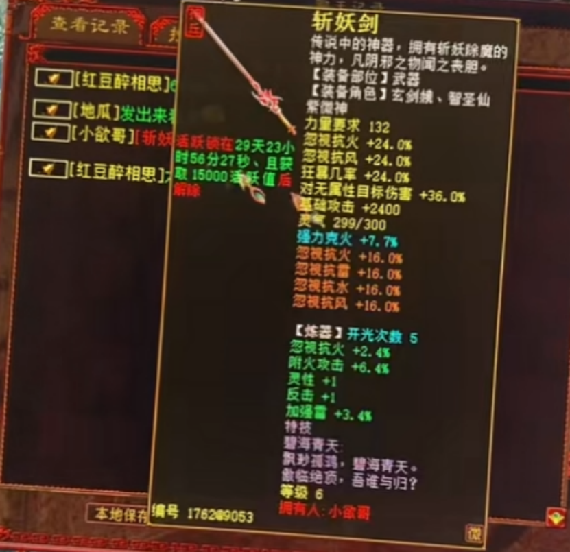 前两天刚刚500万上架的问号一念圣猿,没到两天就改价成350万?傲雪凌霜服务器老铁喜提新神兽!多号开金箱子,看到金箍棒的时候,内心已经很满足了!何大雷一锤子下去,这金光闪瞎了三界?炼化一年的项链,离毕业仅一字之差? 兄弟们好!今天的大话新鲜事栏目准时奉上,一起来欣赏其中的精彩内容吧! 一、终极圣猿改价,直降150万? 前日,刚以500万元价格上架的问号圣猿,如今已改成350万了?这变化也太快了吧! 一念圣猿价格 江湖传言,当时风紧老板出480万要他都没卖,但现在为何降到了350万呢?最终这只圣猿会以怎样的价格成交,我们继续拭目以待! 二、新神兽不夜天降临我兜里! 随着四洲系列新神兽亮相,其中首只神兽“不夜天”也终于觅得归宿,由傲雪凌霜服务器的“几率被鸡驴骑”老铁获得! 系统消息 不夜天全貌 老铁的名字真是已相当亮眼,直接把三界的欧气都吸到他身上了,不知他是会自己打造呢,还是选择出售? 三、金箱一响,神兵到账! 三个号开金箱子,结果出了金箍棒?虽然任务没有被几率,但是开箱子获得惊喜也还蛮爽的! 系统消息 金箍棒 还是一把反击破物理棒子,这波赚大了,也算是开年红了一把,大家在新年伊始,有没有被几率呢?欢迎前来投稿分享! 四、何大雷让他的武器闪闪放光! 玩家给自己的五级忽视火风斩妖剑垫底冲级,本来抱着玩玩的心态,没想到一发入魂,直接冲上六级! 系统消息 武器全貌 何大雷一锤子下去,金光顿时闪瞎了三界,铃铛世界也是一片震惊,一把六级仙法神兵完美毕业,恭喜老铁! 五、炼化一年,离毕业仅一字之差? 炼化整整一年的项链,离毕业仅一字只差,一起来看看这是怎么回事? 项链全貌 十二级项链,底子敏捷11、抗遗忘28.2,蓝字忽视冰1.1,号主炼化将近1年,期间极品属性出过不少,唯一没见过双忽视冰混: 炼化属性 全程用的165的九彩云龙珠,今天好不容易出了个双忽视+抗+敏+反震,可惜是忽视毒,一字之差啊,如果是双忽视抗封,这底子和炼化,卖个5、6万元应该没问题! 今天的大话新鲜事就到这里了,感谢〖三十而立〗、几率被鸡驴骑、Newbee崽崽、青葱岁月、丹青画师等玩家们的热心投稿,小伙伴们如果在游戏内外碰见任何有意思的事情,都可以给我们投稿哦! [编辑:209eodlk]