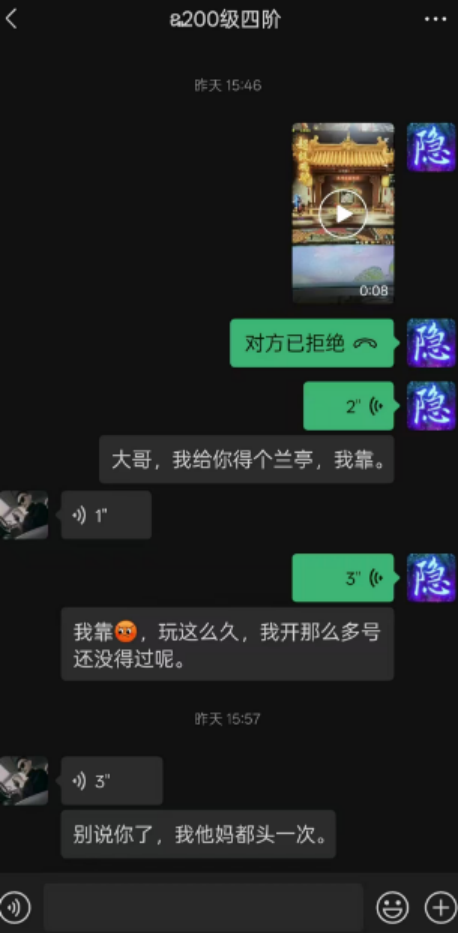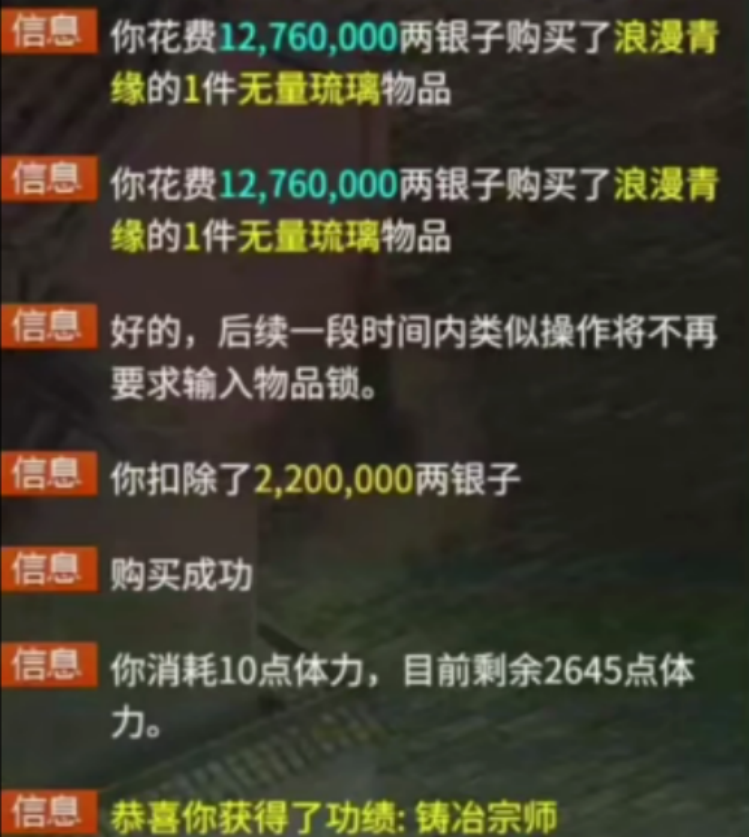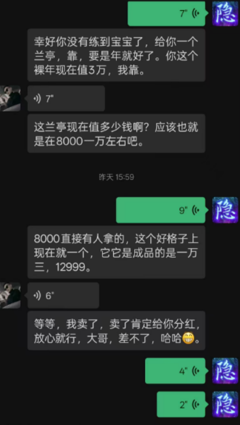 代练得神兽,结果被号主无情拉黑?全服第四只问号圣猿毕业,恭喜大君!价值五十万的冰武器,被神秘人买走!洛阳集市看到一条这样的交易信息,摆摊大哥亏麻了?两块无量琉璃砸出来的武器,赚了赚了! 兄弟们好!今天的大话新鲜事栏目准时奉上,一起来欣赏其中的精彩内容吧! 一、代练得神兽,竟被号主拉黑? 之前的活动中,有代练做任务被几率神兽,联系号主本人有没有分红,结果却被号主无情拉黑,一起来看看怎么回事? 聊天记录 聊天记录 聊天记录 聊天记录 代练做任务获得一只神兽”兰亭“,联系号主本人喜得神兽,号主答应卖了给分红,结果被无情拉黑,兄弟们不妨评论评论,这种情况到底应不应该给分红呢? 二、第四只问号圣猿毕业! 全服第四只问号圣猿,近日终于修出化无,主人依然是君临天下,咱们来看看出化无的瞬间! 系统消息 化无圣猿 一共修炼了15手才迎来毕业,而这也是大君的第三只化无圣猿,整支队伍的实力也因此提升不少,恭喜恭喜! 三、神秘人出手,秒走五十万冰武器! 藏宝阁一把售价50万的冰武器,刚刚被神秘土豪买走,先看看这把武器的属性情况! 武器全貌 一把6阶无属性冰武器,炼器忽视冰5,确实非常不错,但这价格是不是有点贵了,懂行的老铁来评论评论? 四、孔雀明王3999万?有人高兴有人哭! 洛阳集市看到这样一条交易信息,玩家花费3999万两银子,购买了孔雀明王? 交易记录 摊主是不是喝多摆错价格了,这是让人捡漏了吧,有人说双加药也有“孔雀明王羽”,但看着也不像啊,没有数量吧? 五、两块无量砸出极品武器! 玩家用两块无量琉璃砸出一把武器,感觉赚大发了,咱们一起来欣赏! 购买记录 武器信息 两块无量,直接砸出满忽视混7.2的武器,在没用巫铸的情况下也能砸出忽视满底子,这运气确实太牛了! 今天的大话新鲜事就到这里了,感谢招财猫、花公子、超神、一颗橙子、L等玩家们的热心投稿,小伙伴们如果在游戏内外碰见任何有意思的事情,都可以给我们投稿哦! [编辑:韦小贝]