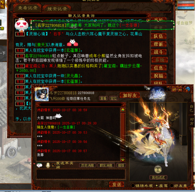 “成年小熊”点出问号,真的是小熊吗?三回合抬走地勇星,就问问还有谁?盖子修炼终极狐小妖,目标只要化无!同样世界喊话,怎么几率就是人家的,我不服!价值7000块的高招项链被点,物超所值? 兄弟们好!今天的大话新鲜事栏目准时奉上,一起来欣赏其中的精彩内容吧! 一、他轻点骰子,秒变百万富翁! 前日凌晨时分,来自凌烟阁服务器的玩家,给他的“”成年小熊”点出问号,可打开一看,竟然是一念圣猿? 系统消息 一念圣猿 这是全服第六只终极圣猿,据说号主直接卖给了大君,成交价在150万左右(据说),按照之前的情况来算,大君手里已经有五只终极圣猿了? 二、三回合抬走十六星,帅翻了! 三回合抬走地勇星,这是什么实力,放眼全服还有哪支队伍能做到? 击杀地勇星 在他们眼里,地勇星都这么不堪一击了么,目前这是全服杀16星最快的队伍了吧,求超越! 三、盖子修终极狐小妖! 盖子修炼终极狐小妖,目标只要化无,一起来看看最终修出了什么技能! 系统消息 一共修炼了5手,分别修出子虚乌有、双管、当头、绝境、赫赫神威,不知这是第几只终极小妖,但结果是没出化无...... 四、世界喊话被人截胡? 同样世界喊话,怎么几率就是人家的,我不服!一起来看看怎么个事? 世界喊话 系统消息 两位老铁世界喊话“来个藕丝”,第一位自己用的没给,第二位拿来卖钱的却收获藕丝,还得是第二位大哥实诚,十三星杀完直接获得藕丝,恭喜! 五、价值七千的高招项链! 藏宝阁中,一条价值7000元的高招项链被神秘买家买走,咱们来看看项链全貌! 购买记录 来自策马江湖服务器的神秘买家,以7000元的价格购买了这条项链,十六级项链底子抗封印41.8、根骨28,炼化躲闪25,特技高级召唤兽支援,这也就男鬼能用了吧,但这价格是不是贵了,老铁们来评论评论! 今天的大话新鲜事就到这里了,感谢诗韵情长、习惯有你、流年、王跑跑、大话西游2红尘等玩家们的热心投稿,小伙伴们如果在游戏内外碰见任何有意思的事情,都可以给我们投稿哦! [编辑:韦小贝]