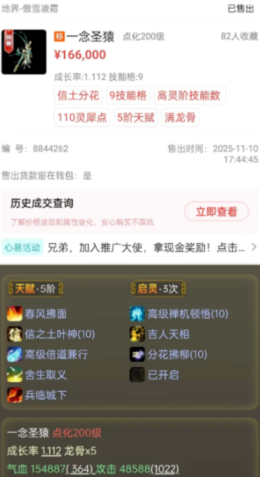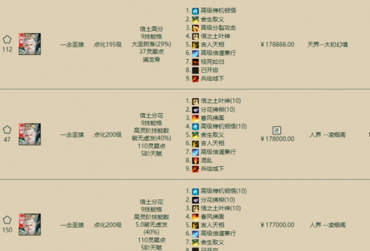 一枚四级符石,售价一套房?但这价能卖出去吗?大君88万拿下全服首只双终极五叶!又一只一念圣猿点出了问号,真的假的?未转男人手持五阶仙器,太牛了!一念圣猿涨价了,来看最新成交价! 兄弟们好!今天的大话新鲜事栏目准时奉上,一起来欣赏其中的精彩内容吧! 一、四级符石,售价超一套房! 一块四级符石,竟然卖到了65万的天价,按现在的三四线城市房价,买一套绰绰有余了吧,但这价能卖出去嘛? 符石全貌 四级青龙符石速度981,只加敏的四级青龙真的值这么多钱么,欢迎懂行的老铁们来评论评论! 二、大君88万拿下双终极五叶! 大君88万拿下全服首只双终极五叶,已经开始修炼,目标化无大当,一起来欣赏! 五叶 据说号主本来开价是80万,但大君哥特意给加了8万,太豪横了,一开始就修出了作鸟兽散和赫赫神威,接下来继续! 三、又一只一念圣猿点出问号? 系统消息,召唤兽“一念圣猿”全身发抖被电击,领悟了一个修炼中的终极技能? 系统消息 问号心猿 原来是给心猿点出了问号,虽然不是大猴,但这离他的梦想又近了一步,这也是多少人羡慕不来的,十几万到手,恭喜恭喜! 四、手持五阶的未转男人! 未转102级的男人,竟然带着一把五阶仙器,做人难,做男人难,做大话的男人更难,现在都卷成这样了吗? 武器全貌 全队都是未转102级,但看队伍的武器都不一般啊,男人手持五阶无属性正骨混武器,一般的小队伍还真打不过这队未转号吧? 五、一念圣猿最新成交价! 要说目前市面最火的宝宝,也就是一念圣猿和心猿了,价格也是一路上涨,目前最新的成交价来了! 藏宝阁售价 成交价 一念圣猿最新成交价16.6万,记得几个月前,一念圣猿的价格也就在12万左右,短短几天时间就涨到了16.6万,按这趋势是不是还要往上涨? 今天的大话新鲜事就到这里了,感谢简单哥、KISS花公子、梦飞、阿星哆来咪、星辰~等玩家们的热心投稿,小伙伴们如果在游戏内外碰见任何有意思的事情,都可以给我们投稿哦! [编辑:韦小贝]