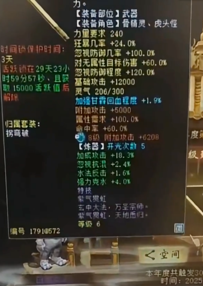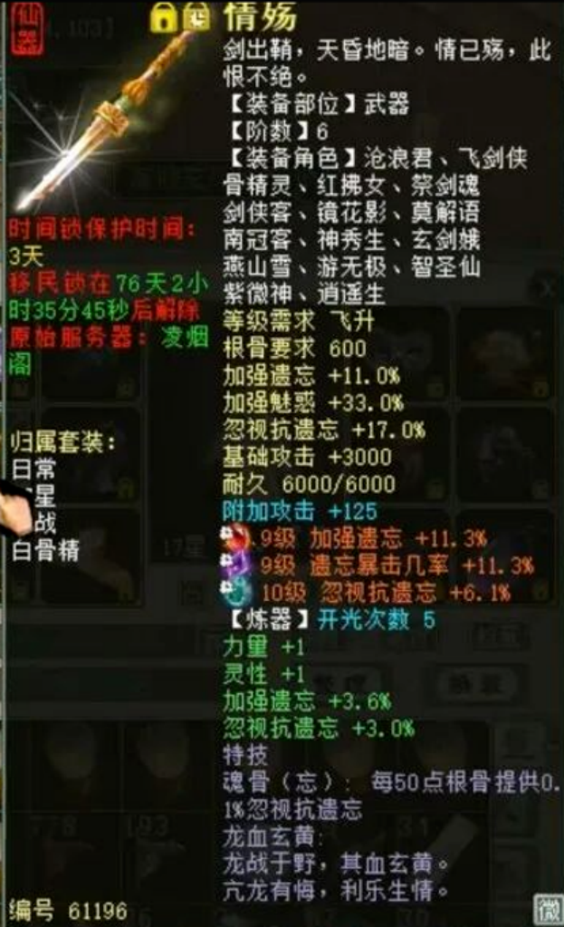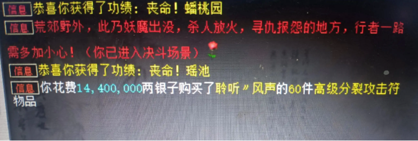 开服第一天,他就怒赚8万,发生了什么?要想富先发疯,两把神兵连续冲上6级,狠人!命丧蟠桃园,结果却捡漏一组高级分裂符?六阶忘武器炼化炼器完美毕业!抗混200的二转男人,飞升号都没他的抗性好吧? 兄弟们好!今天的大话新鲜事栏目准时奉上,一起来欣赏其中的精彩内容吧! 一、开服第一天,此人怒赚八万元! 新区“剑试天下”开服第一天时,这位兄弟竟收获一只心猿!猴子目前市场价格火热,新区价格恐怕要到8万左右了吧? 心猿全貌 这是在名动三界活动中获得的心猿,玩新区的老铁们应该知道物价吧,这比得神兽都开心呀,恭喜恭喜! 二、要想富先发疯,不顾一切向前冲! 要想富先发疯,不顾一切向前冲!两把神兵连续冲上6级,大哥真是狠人啊,一起来欣赏! 藕丝上六 金箍棒上六 6破金箍棒 先给藕丝冲上六级,接着又成功将物理破冲上六破,绝对是拼一次富三代的节奏,主要是胆子真够大! 三、命丧蟠桃园,没想到捡漏了? 玩家正在蟠桃园刷死亡功绩,却让他捡了个漏,花1400万购买了60个高分符,这地府掉得不亏! 系统消息 在刷死亡功绩的时候,看到有人卖高级分裂符文,24万一个,直接买了60个,功绩刷了还赚点小钱,美哉美哉! 四、六阶忘武器完美毕业! 一把六阶忘武器成功毕业,炼化和炼器都很满意,兄弟们一起来欣赏! 武器全貌 六阶忘武器,底子忽视抗遗忘17、加强遗忘11,特技(魂骨)忘,炼器加强遗忘3.6、忽视遗忘3,两颗9级宝石一颗10级宝石,这把武器大家觉得如何? 五、抗混200的二转男! 抗混200的二转男人,一般的飞升男人号都没他抗性好吧?到底是怎么做到的? 人物属性 2转142级男人,抗混200.1、抗封印152.3、抗昏睡157.3、抗遗忘109.9,抗物理127.3,一般人也就做到三抗属性,他一个2转男怎么做到的? 今天的大话新鲜事就到这里了,感谢奇缘、开心姐姐、鸡驴到来、往事不堪回首、老酒等玩家们的热心投稿,小伙伴们如果在游戏内外碰见任何有意思的事情,都可以给我们投稿哦! [编辑:韦小贝]