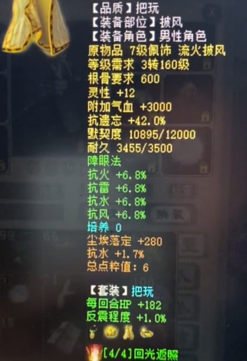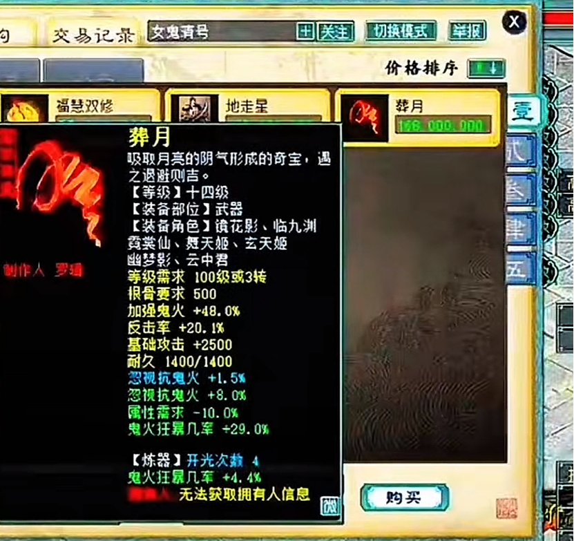 全服第一敏衣服、帽子被他买走,看看什么属性?某神秘玩家以500元的价格购买了一只年,什么情况?集市花1.8亿买的鬼火武器,这算捡漏了吧?如果当初能不取消订单,现在是不是赚翻了?绿字四抗的绝版披风见过没,现在价值多少? 兄弟们好!今天的大话新鲜事栏目准时奉上,一起来欣赏其中的精彩内容吧! 一、全服第一敏套装,被他成功抢到手! 全服第一敏衣服帽子,被名叫“白道口第一帅”的玩家买走,看到属性后不禁感叹,莫非又一位超级敏魔要诞生了? 主人公亮相 衣服全貌,敏速加53 敏速51的超级帽子 衣服总加敏53,帽子总加敏51,两件套顶级敏装以被“白道口第一帅”预定,具体成交价不详,但从现在的市场情况来看,这两件超敏装备的价格应该堪比6阶仙器了吧? 二、神兽年只卖了500块? 某人刚刚以500元的实惠的价格,购买了一只年兽?什么情况啊,莫非是线下交易? 购买信息 这可是神兽年呀,就算指定ID也不可能摆这么低的价格吧,知道内情的老铁们来评论评论! 三、花1.8亿买的鬼火武器! 集市花1.8亿买的鬼火武器,十四级根骨要求,这算是捡漏了吗? 武器全貌 价格1.88亿,底子强鬼火48,蓝字忽视鬼火1.5,炼化忽视鬼火8、鬼火狂暴几率29,炼器鬼火狂暴几率4.4,怎么说呢,只能算不贵,不算捡漏吧? 四、多年前低价卖掉神兽,现在悔不当初! 如果时间能倒转,我一定会下架这些神兽,留着现在去卖,真是越看越心疼! 寄售信息 当初几千块钱卖掉的神兽,现在的身价应该是翻了好几倍,两只泾河龙王、一只颜如玉、一只垂云叟和一只五叶,可惜回不到过去,老铁们你有没有后悔卖过的物件? 五、绿字四抗的绝版披风,兄弟们可见过? 又玩家展示了一件古老的绝版披风,绿字四抗属性,感觉一定会有大佬喜欢! 披风全貌 七级默契披风,底子抗遗忘42、灵性12,绿字抗火6.8、抗雷6.8、抗水6.8、抗风6.8,这样的四抗仙法披风确实很罕见,按现在的市场,应该能卖个好价钱吧? 今天的大话新鲜事就到这里了,感谢赵公子、可乐666、睡到自然醒、君误、C等玩家们的热心投稿,小伙伴们如果在游戏内外碰见任何有意思的事情,都可以给我们投稿哦! [编辑:韦小贝]