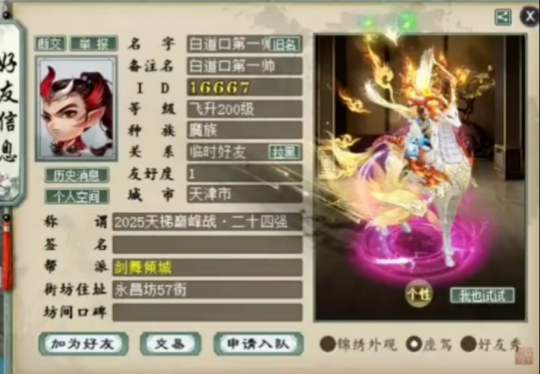 新晋大佬“白道口第一帅”又入手化无神兽,准备进军一线行列!知名一线男魔“浪一下”,加入庞泉酒庄战队,队伍铃铛欢迎!超级灵宝碎片集齐,看看能合出什么?元旦活动首只神兽被他获得!100万收补天,给大爷送到何大雷这? 兄弟们好!今天的大话新鲜事栏目准时奉上,一起来欣赏其中的精彩内容吧! 一、白道口跻身一线敏魔! 新晋大佬“白道口第一帅”,近日又入手化无神兽,这是准备进军一线敏魔的节奏啊,一起来看看! 人物信息 化无雷兽 前不久,“第一帅”才拿下全服第一敏衣服帽子,这又入手一只化无神兽雷,按照目前的物资,可以算一线敏魔了,相信很快就能看到他在赛场上大杀四方吧! 二、浪一下加入庞泉战队! 知名一线男魔“浪一下”加入庞泉酒庄战队,队伍铃铛欢迎,莫非顶级PK的格局又要变天了? 铃铛信息