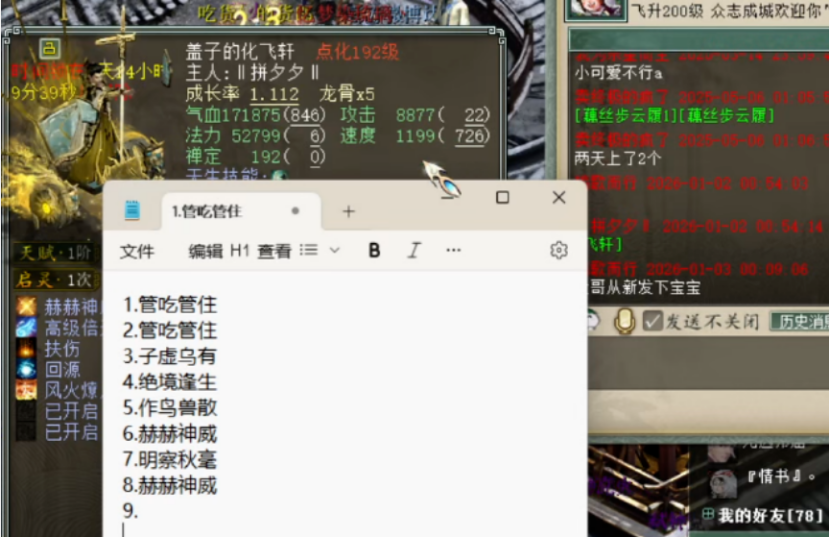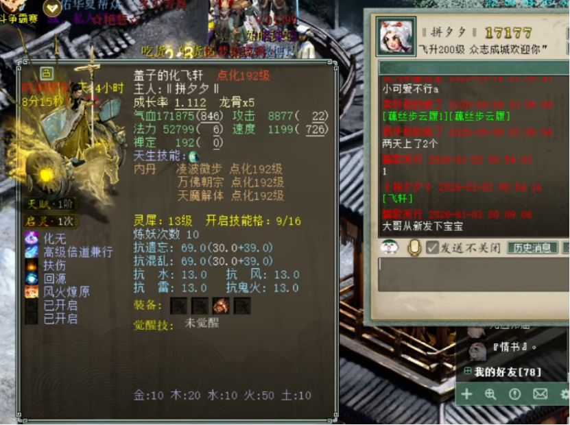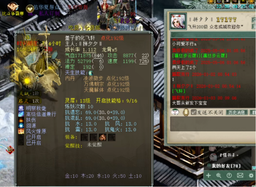 新晋百万血人打造完毕,这名字怎么看着这么眼熟?盖子新男鬼又入手一只问号飞轩,修炼终极技能求化无!十四级普通帽子竟卖了这么多钱,好在哪里?2026最贵的0转0年,太炸了!比武毒女日常属性曝光,求超越! 兄弟们好!今天的大话新鲜事栏目准时奉上,一起来欣赏其中的精彩内容吧! 一、顶级百万血人打造完毕! 新晋百万血人打造完毕,这名字怎么看着这么眼熟,兄弟们记得这是谁吗? 人物属性 这位叫“九届佛远”的男人,血量高达110万,抗混乱185.6、抗封印171.1、躲闪141.9,主冰双反震加躲闪,看样子是专门单挑用的吧,大家觉得这属性如何? 二、问号飞轩重修终极! 盖子新男鬼又入手一只问号飞轩,修炼终极技能求化无,一起来看看能毕业否? 明察飞轩 第九次重修 化无飞轩 经过三天的修炼,分别修出两次双管齐下、子虚、绝境、作鸟、明察、赫赫神威,第九手终修出化无,恭喜盖子又一只化无神兽毕业,期待这个月在比武赛场的亮相! 三、十四级帽子1600被点? 十四级普通帽子售价1600元,上架后就被人买走,一起来看看这帽子价值在哪? 售价信息 十四级帽子龙吟,底子加强风18.7、抗混乱33.9、炼化力量+13、抗遗忘9、特技:无属性行需求,仙法帽子似乎在属性方面没什么要求吧,难道只为这无属性,好像作用也不大吧? 四、2026最贵的神兽年! 我敢说,这是2026年最贵的一只0转神兽”年“,不接受任何反驳,一起来看看怎么事? 系统消息 年兽全貌 新服”瑞雪长安“出了一只神兽年,据本服玩家透露说,这是用雪球积分兑换出来的,新服出的年兽价格应该要很贵很贵的吧,恭喜这位老铁! 五、比武毒女日常属性曝光! 一线比武毒女日常任务属性曝光,看到这属性只能用一句话概括——”最毒妇人心“,一起来欣赏! 属性展示 23万血,1821速度,加强毒伤害234.2、青龙克水515.6,就这两项属性,一般玩毒女的玩家就很难超越了,这毒下去哪个NPC能顶得住,太强了! 今天的大话新鲜事就到这里了,感谢浪子佛心べ、踏歌而行、16克金大力、春晓、小优等玩家们的热心投稿,小伙伴们如果在游戏内外碰见任何有意思的事情,都可以给我们投稿哦! [编辑:韦小贝]