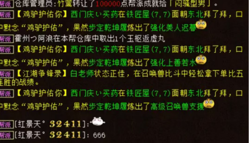 “秦人”再添一只终极神兽“白泽”,属性养眼!这把十六级风法武器,堪称全服最强底子?春节期间合出一块奇异石,这价值得有几十万吧?低召变高召,必须感谢表哥!5级神兵枯骨刀,用六魂直接上六,夫复何求? 兄弟们好!今天的大话新鲜事栏目准时奉上,一起来欣赏其中的精彩内容吧! 一、秦人又添新终极神兽,属性帅炸! 优衣酷战队男人“秦人”,春节期间又添一只终极神兽“白泽”,看来今年的队伍实力又将更进一步! 秦人 以牙白泽 满级满灵犀的以牙白泽,不知后续会不会重新修炼终极,有老铁知道这只以牙白泽之前是谁的吗? 二、最强十六级风法底子武器! 这把十六级风法武器,堪称全服最强底子,一起来欣赏! 武器全貌 据说这位玩家仅用一颗无量就砸出这把武器,底子忽视抗风29.8,蓝字加强风7.5,有人说这是最强的十六级风法底子,大家觉得如何? 三、春节期间血赚几十万? 春节期间合出一块奇异石,这价值得有几十万吧,赚大了啊! 奇异石 春节期间好运连连,合宝石合出一块十级奇异石,果然是鸿福加身啊,这几十万到手了,恭喜恭喜! 四、低召变高召,难道这么简单? 来自凌烟阁服务器的老铁,给自己的低召鞋子炼化,结果炼出高级召唤兽支援特技,这下更完美了! 炼化过程 帮派信息 鞋子就不用看了,6级人法步定炼出高召,这真得好好感谢表哥,也祝表哥马年大吉!马上发财! 五、用六魂冲神兵,过程真刺激! 5级神兵枯骨刀,用六魂直接上六,能不能一发入魂,来个夫复何求? 准备开冲 六级枯骨刀 真的是一发入魂,就这一砸成功冲上六级,小编的心率都跟着上去了,太刺激了,恭喜这位老铁成功上六! 今天的大话新鲜事就到这里了,感谢赵公子、“喜、洋洋洋、西门庆い买药、惊雷等玩家们的热心投稿,小伙伴们如果在游戏内外碰见任何有意思的事情,都可以给我们投稿哦! [编辑:韦小贝]