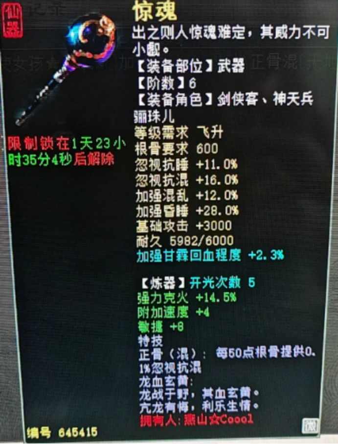 火热春节之际,大君再掷百万拿下终极圣猿!论改名字的重要性,他叫藕丝步云履!18.5万攻击的大力女龙展示属性,求鉴定!六阶正骨混武器,炼器炼出天花板加敏属性,真可惜?人品大爆发,换出神兽,还点出问号? 兄弟们好!今天的大话新鲜事栏目准时奉上,一起来欣赏其中的精彩内容吧! 一、大君豪掷158万,再拿问号圣猿! 时间追溯到大年初一当天,来自红颜知己服务器的老铁身带一念圣猿,结果在修罗任务中直接领悟终极技能“双管齐下”,而后就被大君以158万的价格直接拿下! 双管问号圣猿 真是幸福的丫头呀,这也太爽了,春节期间直接喜提百万,真的是马上发财的节奏,恭喜恭喜,快来吸吸她的欧气吧! 二、论改名的重要性! 论改名字的重要性,这位兄弟刚刚改名叫“藕丝步云履”,结果真获得了一双藕丝,一起来欣赏! 藕丝全貌 看看这名字起的,改明儿小编也改一个几率的名字,看看能不能应验! 三、18.5万攻的女龙,怎是一个帅气了得! 18.5万攻击的大力女龙展示属性,求大家鉴定是不是目前第一大力女龙? 属性展示 飞升185级女龙,攻击18.5万,速度1710,这样的属性称得上第一大力女龙么,欢迎兄弟们留言评论! 四、六阶正骨混炼出天花板属性? 六阶正骨混武器,炼器炼出天花板加敏属性,但围观群众都说可惜,一起来看看怎么个事? 武器全貌 六阶惊魂,底子忽视抗混16、忽视抗睡11、加强混12、加强睡28,特技正骨混,炼器强力克火14.5、附加速度4、敏捷8,炼器加敏12算是天花板级别了吧,可惜了#83 五、今天人品大爆发,感谢表哥赐福运! 他今天人品大爆发,成功合出高级符咒,而后还点出问号,只能说一声感谢表哥了! 系统消息 系统消息 先是用高级符咒换出神兽“颜如玉”,接着给一只“士兵”召唤兽点骰子点出问号,不知道是不是真士兵?反正今年一年的运气都在今天爆发了! 今天的大话新鲜事就到这里了,感谢无名大兄弟、李逍遥、潇歌、素年、幺八幺等玩家们的热心投稿,小伙伴们如果在游戏内外碰见任何有意思的事情,都可以给我们投稿哦! [编辑:韦小贝]