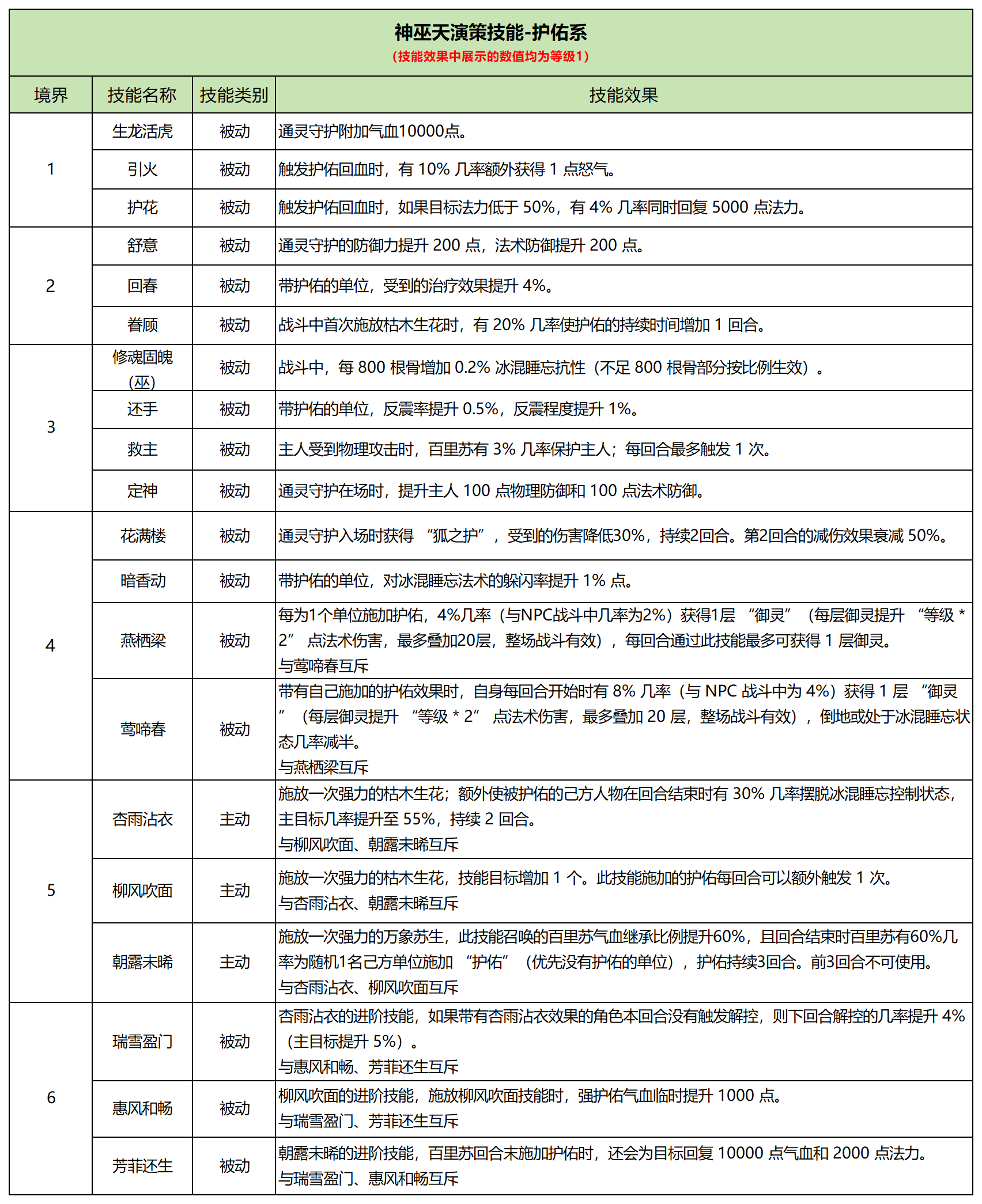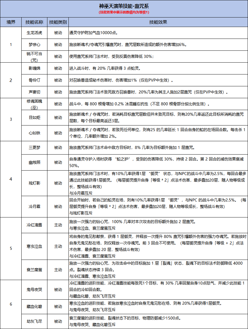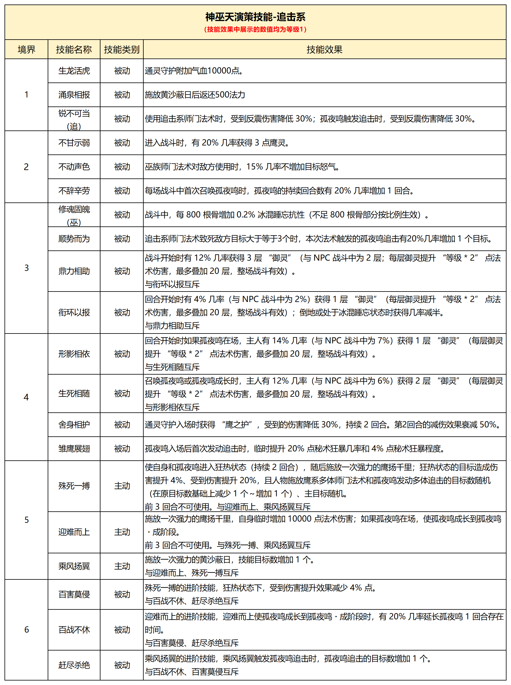 以下内容均基于体验服玩法及数据,具体最终效果以后续游戏实际开放为准。 神巫能否撼动现有的三界格局?而决定神巫战斗表现恰恰离不开法门与天演策。法门技能决定了神巫在战场上的主动爆发与生存手段,而天演策则承载着神巫的成长路线与核心天赋。本文将力求帮助各位少侠掌握法门和天演策的各位技能的底层逻辑。闲言少叙,正篇开启! 1.通彻法门 通彻法门适合综合型发展的神巫,核心定位是提高人物与通灵守护的输出和生存能力,是兼顾日常任务与常规 PK 的万金油选择。 主动技能:动静相宜 技能描述:回合开始前使用,持续一定回合。此期间人物获得*%伤害减免和*%伤害加深,通灵守护同步获得*%伤害减免和*%伤害加深。 实战解析:这是典型的 “攻防双修” 技能,既保障了人物与守护的生存底线,又通过高额伤害加深放大输出。多回合的持续时间覆盖多数战斗核心阶段,是神巫的日常时主修法门技能。 被动技能:阴阳相济 技能描述:人物每使用1次佑护师门法术,人物及通灵守护获得 2 层「通彻 - 阴」(每层伤害减免*%,最多叠加5层,即最高*%减伤);每使用1次追击 / 蛊咒师门法术,则获得 2 层「通彻 - 阳」(每层伤害加深*%,最多叠加5层,即最高*%加深);回合末随机清除 1 层「通彻 - 阴」或「通彻 - 阳」。 实战解析:动态增益机制让通彻系越打越强,适配多回合持久战。佑护法术叠加减伤,追击 / 蛊咒叠加输出。在满法门情况下,被动技能结合主动技能,可让神巫与通灵守护的伤害加深高达30%左右! 2.守中法门 守中系专为血抗型发展的神巫设计,核心围绕 “减伤、防御、抗性强化” 打造,是血队PK、高难 BOSS 挑战时可考虑选择的法门。 主动技能:金甲护身 技能描述:回合开始前使用,持续多回合。期间人物与通灵守护获得*法术防御、*抗仙法鬼火秘术狂暴率、*物理吸收率、*防御、*抗致命、*伤害减免,且每回合开始前回复自身*%气血;技能冷却10回合;无通灵守护时,属性加成与回复效果额外提升 30%。 实战解析:全方位的防御属性覆盖让守中系成为绝对的防御堡垒,配合持续回血,保障神巫越战越勇。但是需要注意的是在无通灵守护时额外30%加成的设定,这个强化设定对神巫战斗首回合的站桩能力意义重大。 被动技能:化煞为用 技能描述:人物与通灵守护受到敌方法术 / 物理伤害时获得法门,首次攻击必叠加1重,连击后续攻击几率增加;每重法门提供*法术防御、*抗仙法鬼火秘术狂暴率、*物理吸收率、*防御、*抗致命、*伤害减免,最多叠加5重;每回合末法门重数自动减1,未受攻击则额外减1。 实战解析:经典的 “挨打变强” 机制,越抗伤属性越高,完美契合血抗神巫的承伤定位。5重满叠时,防御、减伤、抗性全面拉满,适合持久战。 3.双生法门 双生系同样适配综合型发展的神巫,核心能力通灵守护强化与双召唤战术,是召唤流玩法的核心法门,主打以多打少的输出压制,尤其是走蛊咒系的神巫需要重点考虑。 主动技能:如影随形 技能描述:回合开始前使用,持续4回合。此期间使用师门技能召唤时,额外召唤1只 “双生” 通灵守护;额外召唤成功1次后状态消失;“双生” 守护气血为正常守护的*%,造成伤害为正常守护的*%。 实战解析:在后面我们会讲到天演策技能,其中有一个天演策技能可让神巫进场通灵值增加3点,达到第一回合通灵值6点。配合双生法门,可第一回合实现双生通灵守护进场。 被动技能:同气连枝 技能描述:通灵守护气血、法术伤害继承比例提升*%,且通灵守护在场回合有*%几率延长1回合。 实战解析:被动双生法门从属性继承与站场时间来双重强化通灵守护。较大的继承比例让守护属性更贴近甚至超越人物,大幅提升输出与生存;高几率延长1回合更是实现 “召唤一次,长期作战”,完美契合双生系的战术逻辑。 1.通用天演策技能 八大通用技能,分别包括魄蕴(增加根骨)、润颜(附加气血)、寒光(附加魔法)、飞袖(抗反震)、绝尘(附加速度)、护盾(增加物理吸收率)、动气(增加法术伤害)和凝神(增加法术防御)。 2.追击系天演策技能 “殊死一搏”是一个高风险、高回报的追击系大招。它的核心是 “用生存和随机性换取输出上限和单位数量” 。开启后,虽然自身受到的所有伤害会大幅增加,但造成的伤害也会提升,属于爆发性输出。并且在满技能效果下可能会随机增加3个单位,出现神巫追击系秒八个单位的情况。 “迎难而上”是一个偏重爆发与质变的强力技能。相比“殊死一搏”的“高风险随机输出”,“迎难而上”更稳定、更直接,核心在于瞬间提升巨额法术伤害,法术伤害可通过强力克/狂暴等继续扩大最终输出。并能强化召唤兽“孤夜鸣”,通过测试发现可以跳过孤夜鸣的第二形态“化”,直接进入第三形态“成”,配合人物的高额法伤打出更高集火爆发。 它不提供伤害数值或暴击率等属性提升,只改变攻击的单位数量。满技能下可以增加五个单位,达到可以10个单位的群伤效果。非常适合在对方单位密集时使用,当配合多只孤夜鸣时清扫效果更佳。 3.蛊咒系天演策技能 通过上次我们对神巫技能机制的分析了解到,神巫常规蛊咒系法术对敌方一回合至高可以叠加4层蛊咒层数。而“冷红滴露”在满级效果下可以100%为本次攻击的目标额外施加10层蛊咒层数,配合天演策技能“三更梦”,瞬间让后续战斗引爆蛊咒层数的伤害达到恐怖的数据。对于敌方阵营来