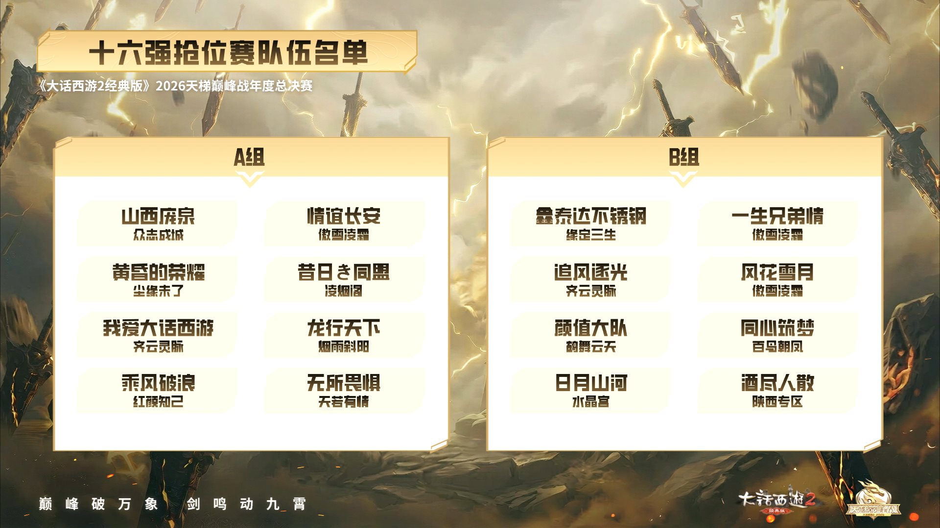 巅峰破万象,剑鸣动九霄!2026天梯巅峰战年度总决赛16强抢位赛将于今晚19:00正式打响!目前24强战队已整装待发,9~24号种子战队率先登场,一场酣畅淋漓的巅峰对决即将拉开序幕。此外,提前参与巅峰竞猜玩法,还有机会赢取ROG枪神8笔记本电脑、一念圣猿铜摆件、珍稀年兽手办、2025鎏金宝鉴典藏版等丰厚赛事嘉礼! 大赛开幕之际,24支巅峰战队齐齐亮相。他们是天梯赛场上千锤百炼的顶尖强者,集实力、经验、战术于一身,代表着三界最高竞技水准。让我们一同欣赏参赛选手们的傲人风采,也衷心祝愿所有参赛战队发挥出色、披荆斩棘,摘得属于自己的荣耀! 今晚19:00,9~24号种子战队将率先登场,本轮将分为两个小组、每组8支战队,在4月9日~4月12日期间展开BO1单循环对决,最终每组积分前4的队伍可获晋级,赢得下一轮8强抢位赛的资格! 详细分组赛程安排请查阅: 大战在即,“巅峰竞猜”玩法也已经开启,少侠打开游戏左上角天梯巅峰战,选中巅峰竞猜页面参与其中,竞猜成功即可获得积分奖励,积分除了可兑换各类游戏道具外,还有机会获得ROG枪神8笔记本电脑、五常鎏金酒具礼盒、珍稀年兽手办、一念圣猿铜摆件、2025鎏金宝鉴珍爱版等实物大奖! 随着年度赛盛大开幕,"巅峰创作奖励"活动也同步火热进行中!围绕赛程解读、赛事战报、高光集锦、战术分析等主题进行创作,发布时带上话题#2026天梯巅峰战及#大话西游2经典版,按常规方式投稿即可参与,有机会瓜分超4万元大奖,以及最高1888元现金红包、精美周边等惊喜奖励!其中表现出色者,更可赢得包机酒线下观赛资格,直通青岛线下总决赛现场,亲历巅峰对决! 人气主播助阵,精彩绝不容错过!2026天梯巅峰战年度总决赛正式开幕,多位大话人气主播倾情加盟,带你近距离感受巅峰之战的极致魅力。届时还请少侠们多多前往收看,为心仪的战队与选手加油助威——参与观赛互动,还有机会赢取精美周边好礼! 巅峰英雄集结,大战一触即发!今晚19:00,2026天梯巅峰战年度总决赛正式揭开战幕,9~24号种子战队即将登场,打响这场荣耀之战的第一枪。密林深处,虎啸龙吟;巅峰之上,剑气纵横。愿各路少侠旗开得胜,在这片最顶级的竞技舞台上,绽放属于自己的璀璨光芒! [编辑:莫听雨]