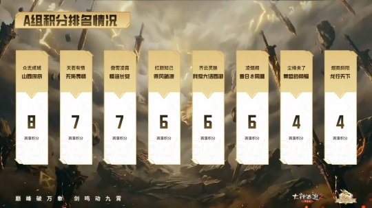 巅峰破万象,剑鸣动九霄!2026天梯巅峰战年度总决赛16强抢位赛首日比拼结束,八支种子战队率先在16强抢位赛中展开厮杀,经过四场循环对抗后,目前首轮积分排名已火热出炉! 以上八支战队也将在4月11日周六继续展开角逐,以决出晋级下一轮的四支队伍;同时16强抢位赛B组的八支种子战队也将在今晚19:00登场,还望选手们勠力同心,奋勇冲刺更高排名! 天梯烽火已燃,“巅峰竞猜”玩法也已全面开启,少侠别忘了打开游戏左上角竞猜页面进行参与,竞猜成功即可获得积分奖励,积分除了可兑换各类游戏道具外,还有机会获得ROG枪神8笔记本电脑、2025鎏金宝鉴典藏版等实物大奖! 战鼓响彻巅峰,大战接踵而至!4月10日19:00,2026天梯巅峰战年度总决赛鏖战继续,届时官方也将全程进行直播,欢迎少侠踊跃前往观赛,也多多参与巅峰竞猜玩法,超多赛事好礼正在放送中! [编辑:叶子猪小秘书]