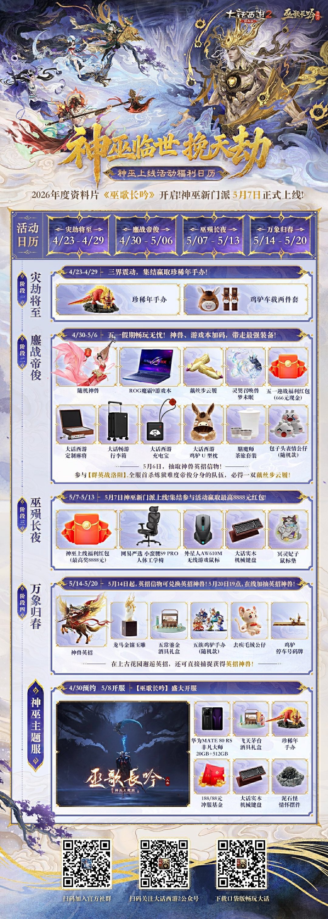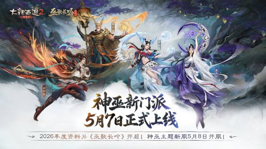 心连三界,灵通万方!2026年度资料片《巫歌长吟》各项内容陆续揭秘,全新门派“神巫”将于5月7日正式上线!5月7日维护后,想玩神巫的少侠们,可以在游戏内新建神巫角色,也可选择将现有五族角色转为神巫。 全新主角梦烟罗、炽羽客、悬月引、漠归尘即将登场。全新召唤机制、专属通灵守护,将为各位少侠带来更丰富的游戏体验! 为了让各位少侠轻松畅玩,领略神巫魅力,我们还将为大家带来转神巫福利折扣 、神巫体验装备、回流福利升级等多重福利活动,更多资讯即将揭秘,可关注后续官方资讯!资料片内容可查阅专题: 伴随神巫入世,神巫主题新服【巫歌长吟】重磅来袭。新服将于4月30日开启预约,5月8日盛大开服!本周五(4月24日),兄弟抱团预约活动率先开启,抱团可领神兵抽奖券! 开服后,史“巫”前例的新服活动福利等待少侠解锁——神巫·年岁之契”计划开启,达到条件可领新手灵契召唤兽,梦未眠、复活女娲、孔方三选其一;参与“神巫·义气守护”活动,情怀召唤兽小浪淘沙免费赠送,致敬经典情怀回归;老友回流神巫服,更享专属称谓、经验加成及副本特权;转种族、转修正特权福利同步奉上,助少侠畅行三界。 玩神巫新服,更有华为Mate 80 RS 非凡大师、飞天茅台酒具礼盒、珍稀年手办等实物好礼掉落,还有机会抽取鎏金宝鉴召唤兽(随机)、全新灵契召唤兽梦未眠等,惊喜不断。更多活动福利,敬请关注后续新服公告。 本周维护(4月23日)后,2026神巫上线活动“神巫临世挽天劫”阶段一将全服开启,诚邀天下英豪与神巫同心携手,共抗强敌,守护苍生! 神巫上线活动分四阶段逐步解锁,活动期间将有机会获得各类神兽、一级神兵、一阶仙器等珍稀道具,更有机会获得ROG魔霸9游戏本笔记本电脑、6~8888元现金福利红包、龙马金镶玉雕等惊喜实物奖励! 全新副本【破妄引魂归】也将在本周维护(4月23日)后开启局部测试(测试服务器:百鸟朝凤、相爱一生、白衣胜雪、花间独酌)!该副本将采用开放式自由探索模式,少侠可随心抉择前行路线,自定义任务配置。通关评级将根据蚀心之野净化耗时与帝俊挑战难度综合判定,勇攀高峰者,殊荣更盛!海量经验助力,更有神兵、仙器、终极技能修炼丹等稀世重宝静待强者,破局即可收入囊中! 2026年度资料片《巫歌长吟》之“魔窟新探”、“群玉书库”内容均已开放全服,欢迎各位少侠体验! [编辑:莫听雨]