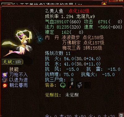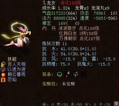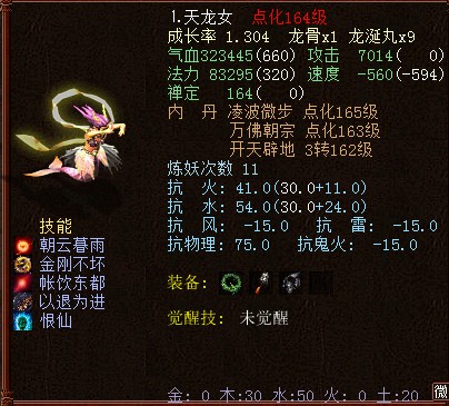 技能选择: 低投入3转血龙女的话技能首选 以退为进,朝云暮雨,金刚不坏,恨仙,4个技能取3个没4个格子只能取消掉金刚或者朝云,金刚可以抗致命我上面那只就选错了 选了刀枪不入那点防御还不如抗点致命,以退为进是反震的配合内丹这个很需要有进退自如更好。 朝云暮雨是用来对付有些铁抗仙法 这个是我10W亲密龙女的抗性,可见如果亲密高的话对面根本不能致命。