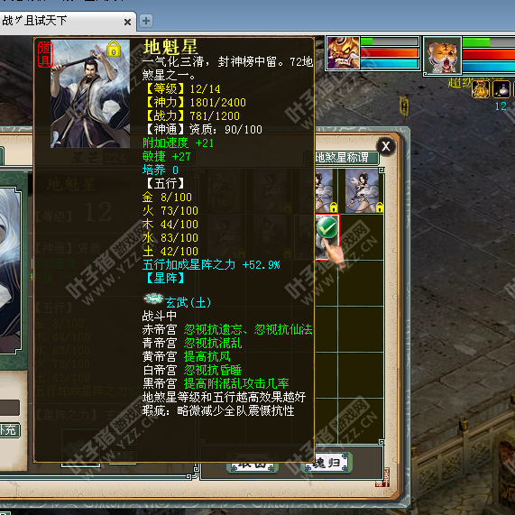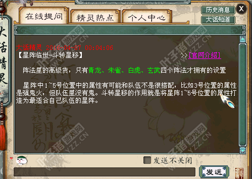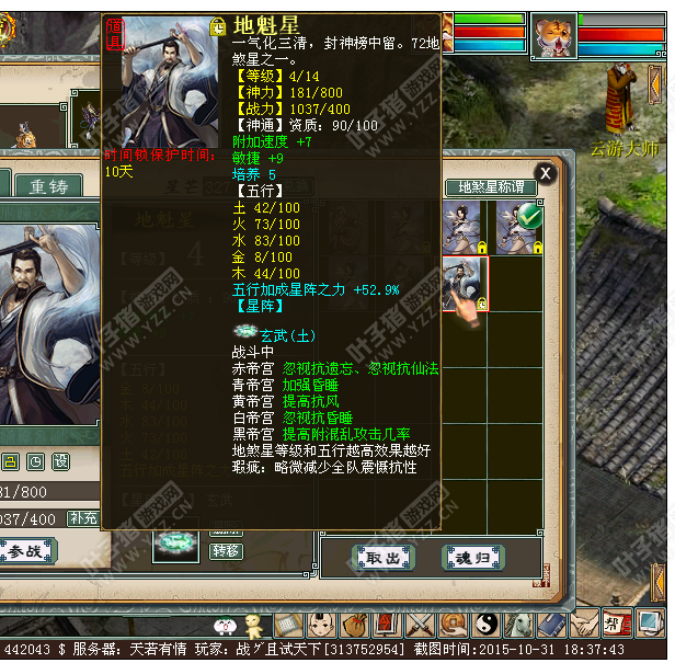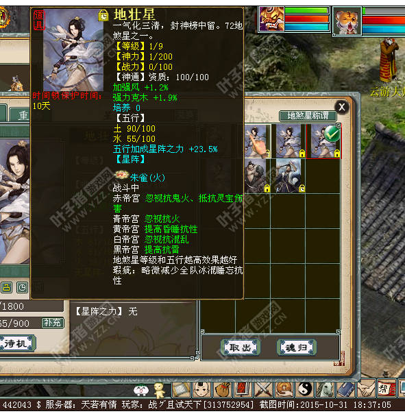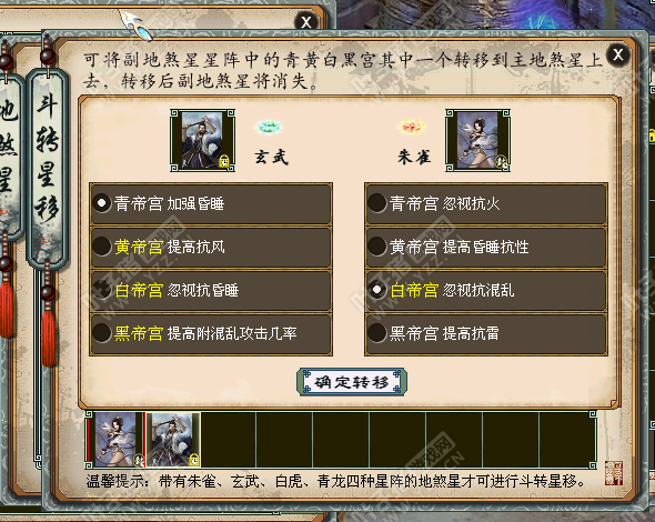 大家好!我是天若有情的战且试天下,今天给大家带来的是星阵转移的玩法,其实我在2015年10月31号转移星阵时就想发表文章的,那时觉得应该大家都知道,所以没必要发表文章了。 就在昨天,我的一位资深老玩家,问我关于星阵转移的一些相关事项,于是我就找出来以前的截图,发给他看。 转移星阵只有青龙,朱雀,白虎,玄武才可以转移的,详见下图。 并且第一宫位是不可以转移的。如果看中了星阵,但宫位不怎么适合的就可以通过斗转星移的玩法来完美解决这个问题。比如我买了一个双敏的玄武星阵,如下图。 主玄武星阵 由于没有忽视混的,队伍是混人,所以搞了个忽视混的朱雀带忽视混的来转移星阵,免费转移的,转移后副星阵消失于天地间。 副朱雀星阵 转移时