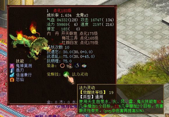 2、内丹和技能,这个就很明了了,内丹为红颜白发(有几率出狂暴)开天辟地(有几率加忽视)梅花三弄(2、4法有几率出连击),技能为怒仙和恨仙。经实践,本人更倾向于走狂暴流,一是忽视只是有几率出,还不高,5,60%的样子,二是并不是所有比斗宝宝都有针对抗,狂暴适用性更广。 3、召唤兽套装:法力灵动和听天由命。如果说前两点是基础伤害的话,套装的介入才使法秒的伤害真正登堂入室,毁天灭地了。本人只有法力灵动。 4、坐骑。坐骑能加法强,能加灵性,所以会影响到伤害,但具体有多大影响,因为没办法开展实验,在此就只能一笔带过了。 以下是本人的敏秒: |