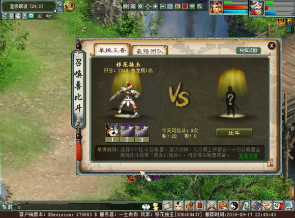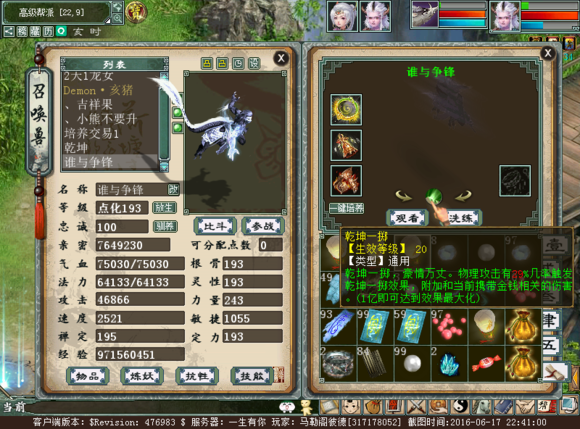 总结下,乾坤一掷,适用范围广,血宝宝,敏宝宝,敏功宝宝,都可以用,PK意义比较大,比如一只化无画皮,要是加全功,砍一下就 震死了,功再高也没卵用。 可能你们会说一刀砍死男人,但是现在那个角色不带金刚,换句话说,只要连击才能弄死人,这问题就来了,如果450力量全血画皮,跟全力画皮来比,不连击都砍不死人,但是连击必死,因为有乾坤,全力画皮就存在被震死的风险~~个人看法! 大圣附身,适用单一,伤害爆表,实用性差,只有力量达到950的时候才能跟乾坤扯平,拿升级来说,950力量属性点的宝宝还能有多少敏,现在升级宝宝基本都得有个900-1000的速度,至于加了950力量还有多少敏捷,就看你们的宝宝了。 最后展示一下我的比斗排名