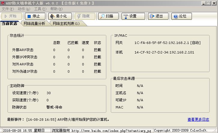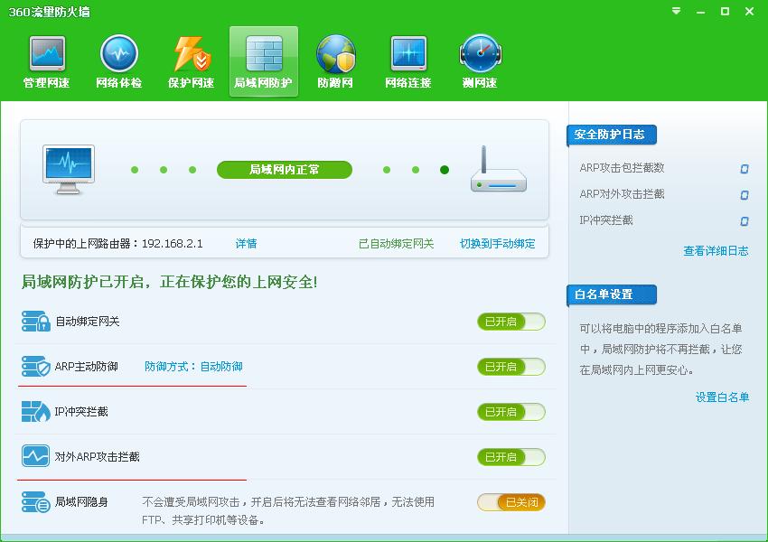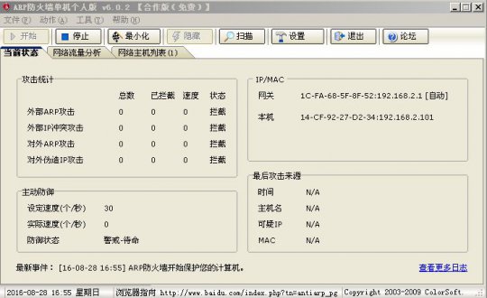 第二种掉线情况是,和你一起共用网络的用户有人中了ARP的病毒,这种病毒会不停的对外发送数据包,造成网络堵塞。用我那个测试工具可以测出来,上面显示的时间会很长。经常出现短的。那么我们需要安装ARP防火墙。我是用下面这个防火墙。360安全卫士里也有ARP防火墙功能,打开就可以了。见下图 ARP防火墙