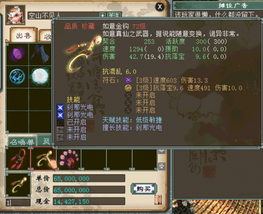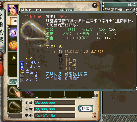其实洛阳集市的攻略那都是仁者见仁智者见智,你一定有你自己心中的攻略。而这些攻略一定是经常逛集市总结出来的,洛阳集市总是大话人流最多的地方(没有之一),希望各位看官没事了也去洛阳走一走看一看。 最后给大家出一道思考题。以下两件灵宝哪一个更实用。他们最合适的价位应该是多少? 宸午针初始伤害17.9低级敏捷增强