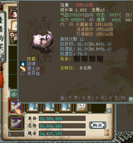 没事抬头看看世界和当前,反正也是逛集市多个目标多个机会 套路分析到这里,我们再看看目标的选择,比如说我们要召唤兽,除非你有特定的要求,我们可以关注下: 1、高成长未变色的天书宝宝。作为召唤兽属性是硬道理,天书宝宝相比1-14称宝宝成长高的优势和二阶天赋优势外加技能优势,这都是黄金兽、冰雪魔无法比拟的。 2、变色的高成长天书宝宝,变色天书宝宝普遍有个现象那就是撞色,比如粉色的猫咪,一不小心就看成白色的了,结果一不小心当白色的就卖了,比如粉色的当康和没变色的颜色也不好分辨。比如蓝色的罗刹鬼姬,一个不小心就觉得他没变色。这没事了点一点万一遇到没看清上架的你看清了不就赚了吗?