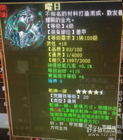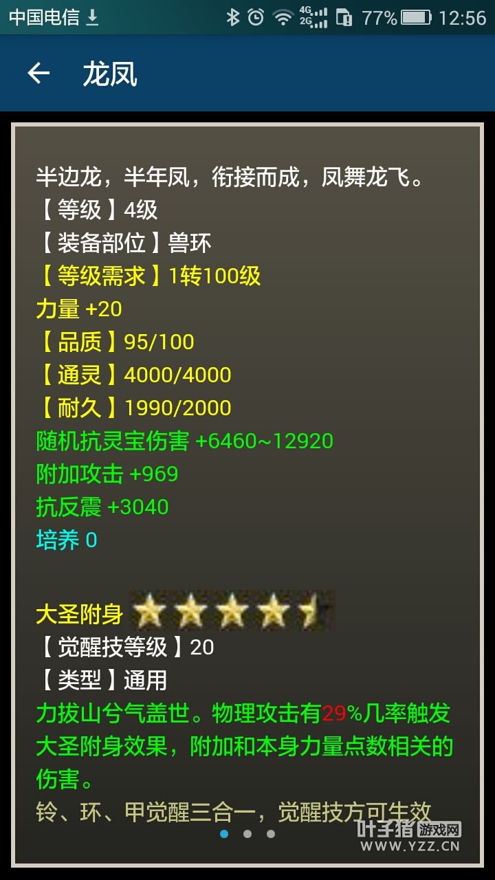说完一击毙命,我来说下乾坤一掷、大圣附身、同仇敌忾,这三个技能,我是按照最实用来排名的,乾坤一掷只要身上带着1亿现金就可以达到最大效果,要注意,是带现金,不是存款。所以这个觉醒技能适合范围比较广,现在的攻宠相对来说敏攻的多,全攻的少。所以我是推荐用乾坤一掷,满级觉醒是相当的牛B的,机率可以到时30,出连击的话,那效果是相当的明显。见下图 4*半满级有30机率(微信上看到的) 大圣附身由于对宠的加点有限制,所以使用的人就相对少一点了。据我了解说是要加900点力量才能出最大效果,加了900力量,敏就没有多高了,所以用的人相对少一点。20级4*半满级29的机率如下图: 4*半满级有29机率(宝阁上看到的)