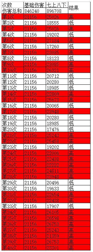 1.四十次伤害,共出现高于原始伤害25次,低于原始伤害15次,高于时伤害约在1%--30%之间浮动,同样低于时也在1%-30%之间浮动。 2.伤害提升和减弱是建立在基础伤害上的,如果你带上装备平秒十万,就可能出现13万和7万之间的不同结果。 3.一但带上这个特技,秒到所有的单位全部生效,同时所有单位会出现各不相同的高于或低于基础伤害的机率 4.由于没有做更多次测试,测试数据也不是很完善,但是可以推测出现高于基础伤害的机率要略大于低于基础伤害的次数,经过计算发现,带特技总体伤害要多于不带,因为用裸体一法单秒,伤害总和只是略高于不带,但是如果通过带上装备和五法秒之后,伤害总和会有非常的差距! 所以我得出一些结论: 1.如果在护身黄字绿字相同的情况,仙族可以秒出更爆力的伤害(当然黄绿字都好并带有该特技的护身真是凤毛麟角) 2.PK时会有意想不到的效果,七上八下的伤害会打得对方措手不及。 3.追求更漂亮的数据的仙鬼朋友,如果正好拥有黄绿字都好的七上八下护身时,等于多了一张负30%至正30%的之间程度卡,会打出更漂亮的数据,人往往总是会把眼球暗集在爆力点上。 4.在享受爆力伤害时,也会带来一些麻烦,比如想秒的秒不死,不想秒死的秒死了,所以这个特技不利于本身秒得就不多的平民党们。 下面是测试的时候的一些数据截图!
