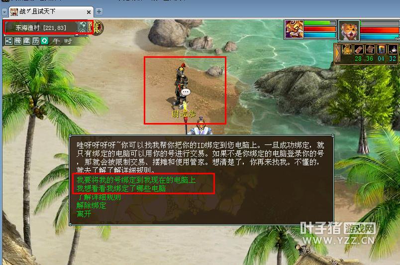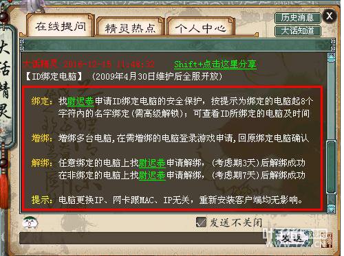 由于我兼职做大话2的,我上过几百个客户的大话2游戏号,有很多人的游戏号都没有绑定将军令和绑定电脑,其实这样特别不安全,虽然说我上他们号只刷功绩,我不会动他们东西。但是不能保证别人上他们号不动东西。还有一些用密保卡的请赶快升级为将军令,如果没有绑定电脑的,请赶快绑定电脑。如果不懂绑定电脑的,请进入游戏来到东海渔村坐标218.90,点尉迟恭,点我要将我的号绑定到我现在的电脑上。如下图: 请注意:绑定电脑的号,如果长期不上线也不安全。我有个朋友绑定电脑了。出差半个月,回来号被清了。于是在微信群里骂街,说绑定电脑怎么也被清号。如果是绑定电脑申请取消绑定要3天时间,如果非绑定电脑取消绑定只需要7天时间,所以绑定电脑安全期是7天,如果有人可以上你的号。你必须在7天为一个周期必须上号看系统提示。如下图。 电脑绑定说明