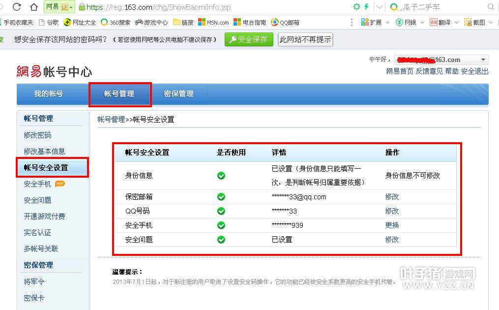 最后请麻烦每个人都登陆自己的账号查看下这些安全信息是否设置了。假如号忘了或被盗了。可以通过这些来修改。如下图: 账号安全设置