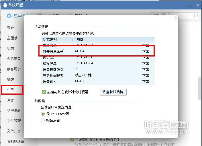 由于我的微信好友毕竟有限,只有1000多个,所以我想借助叶子猪网站,让更多遇到这问题的朋友解决这问题。遇到这个问题是由于部分软件的热键刚好设成了ALT+A,所以会造成热键冲突。那么找出来会冲突的软件把快捷键设成别的就可以了。如果不懂找,就把最近装的软件卸载后重起后,就可以恢复了。我特意找了3个有可能会造成热键冲突的来示范下如何修改热键的。朋友们可以参考下。比如QQ游戏如下图: 点右上角红框里的设置,点系统设置 点基本设置,热键设置,把A改成其他的。