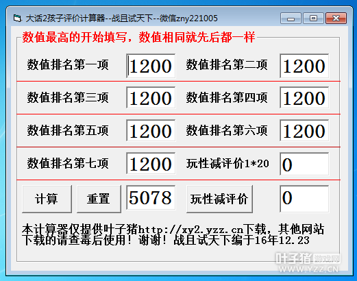 经常有一些回归玩家或对孩子是新手的玩家对孩子非常困惑,今天给大家带来的是孩子评价天资计算器揭秘孩子数据,带新手走出误区。 先从第一个误区开始说,认为叛逆和道德加的评价高。网上有特别多的养孩子攻略,有些攻略确实不错,但也有部分攻略会引导别人走进误区。比如很多攻略都是推荐先把叛逆和道德养满1200后再来养其他5项,理由是说叛逆和道德加的评价高,所以我在微信群里看到很多把孩子发出来都是叛逆和道德接近1200了,其他的还没有怎么培养,就在那问,这孩子能到神结局吗?其实如果是追求神结局的,先把前面5项先培养到999,这样就可以保证出神结局,然后把最接近1200的先养满,有些地方会减属性的或加玩性的最好别去。 新版孩子已经出来很长时间了,7项数值是计算评价用的,很多人认为叛逆和道德加的评价最多,其实这是错误的,为了证明这7项数值都一样,只是按数值大小排例,每一项取一定的比例出来。我特意编写了一个软件来计算评价。证实评价是按数值大小排列为ABCDEFG,玩性就是H,具体看评价计算的公式:职业评价=600*A0.2+180*B0.2+150*C0.2+120*D0.2+90*E0.2+60*F0.2+30*G0.2-H*20 。软件界面如下: 计算孩子的评价
