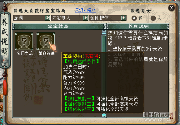 第二个误区是认为只有神结局的孩子才是好孩子,其实不能这么说的,孩子如果还没有开始养或还没有出结局的话,最好先确认下自己的需求,可以点开孩子,点养成说明。选择自己需要的技能来选择自己的结局。如下图: 每项结局都有达成条件