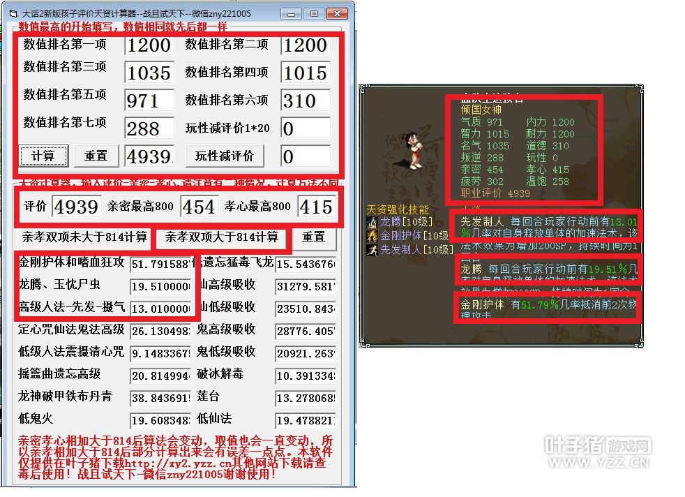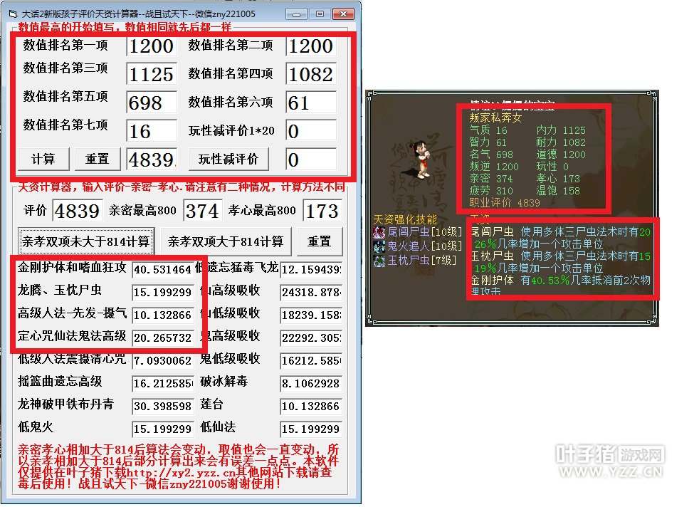 为了证明孩子评价亲密孝心都很重要,我特别挑2个评价都差不多的孩子来对比。一个是4871的新孩子亲密49,孝心60详见下图: 还一个是老版的垃圾孩子,评价4839,亲密374,孝心173详见下图: 通过这2个图片来对比下。可以清楚的看出评价高。亲密孝心低的时候,金刚护体发动机率是23.73,还个孩子评价低,亲密孝心高一点,金刚护体发动机率是40.53,通过对比,评价不是唯一检测孩子的标准,亲密孝心也在左右发动机率,顺便还可以对比下我编写的评价天资计算器是否准确。 如果孩子亲密孝心相加大于814以后,使用软件时要点击第二个按钮,亲孝双项大于814计算才准确。详见下图: 金刚和嗜血和龙神和破甲这些是固定的,其他的会有点波动