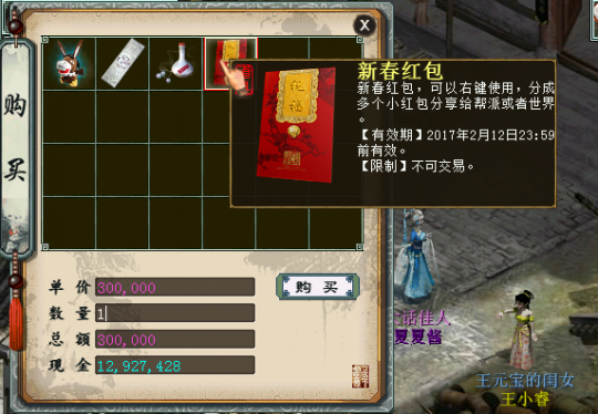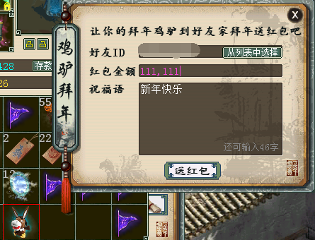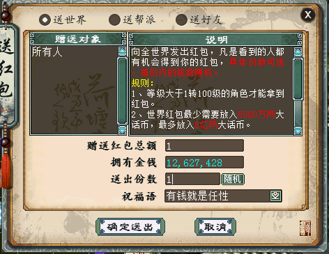 派发红包有三个选项“送世界”“送帮派”“送好友”。其中“送世界”最低5000W,“送帮派”最低500W,“送好友”最低得100W。 啊~原来任务栏的1两也是爱只是骗我这种单纯的孩子╮(╯▽╰)╭心好累~派红包的事还是交由土豪去做吧!