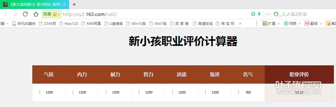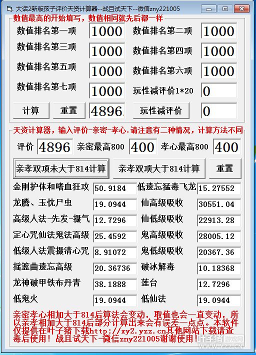 明显相同属性点下,评价变成5052,明显评价增加了31 如果有些朋友还没有看出来,那么我举个最简单的例子,假设孩子有7000点属性,我们按照2种方式来加点,对比下两种加点方式得出的结果是不是一样。第一种方式是每项加1000点平均加点方式,打开官网计算器来计算下,如下图: 每项1000加点是4897评价 我们按照前面几项加满1200来计算,可以分配到5项1200属性点,一项1000,最后一项为0,详见下面2个图: 7000按1200每项来分配 相同点数下,评价变成4946,相差49点评价 明显可以看出来相同属性点,不同加点方式,得出来的评价是不同的,这是由于孩子评价计算的公式造成的,孩子评价计算公式的算法是7项按最高值取比例最多,第二高数值取值低一点,依此类推,详细的可以看下我以前发的文章。或者打开叶子猪首页,点开孩子天资计算器,或者打开http://xy2.yzz.cn/guide/201701/1056824.shtml直接查看。 经常有朋友会问我孩子成年后的孩子怎么涨评价,今天又有朋友问我,他的孩子能不能到5000,如下面2个图: 问我能到5000评价不
