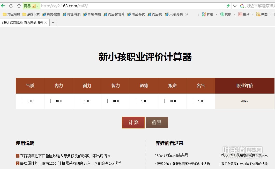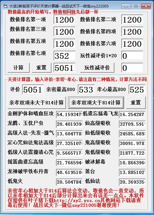 大话2孩子相同属性下会有不同的评价,今天为大家分享这个技巧,适合正在养孩子和已经成年了的孩子。 我在朋友微信群里看到一位朋友发了一个孩子5020评价的孩子,然后他在下面发帮人养孩子。孩子图片如下: 我看了下这个孩子的加点方式不是很好,同样点数的情况下可以得到更高的评价,评价5020可以提升到5052的。 该玩家是帮人养孩子的,我出于好心想帮他,让他以后帮人养孩子的时候可以在相同点数情况下得到更高的评价。 于是我告诉他,这孩子相同点数下,先把越接近1200的先养满,可以提高评价,并且把孩子评价天资计算的文章发给他 >>>战且试天下为叶子猪制作的工具:孩子评价天资计算器公布 带新手走出误区 对方开始质疑我,问我见过5078孩子没有?问我懂不懂孩子,不懂孩子不要乱说,然后一直骂我,他说他的境界不需要任何人教,问我懂不懂什么叫孩子磨合,说我这是在踩他。 我给他解释,也发誓我只是想帮他提高评价,发誓没有踩他的意思,如果不信我制作的计算器可以去官方孩子计算器那算下评价值,如果按我说的同样属性点的情况下,先把接近1200的养满,是不是可以提高评价? 他不信,还是一直在发语音骂我,骂个没完没了。 我其实只是出于好心想帮他,他非但不领情还一直不停地骂我,我表示很受伤,仔细想想自己也做错了,平时一直谨记看穿不说穿的为人处事方式,一时没忍住,后悔死了。 同样点数的情况下可以得到更高的评价确实是一个技巧,所以今天把这技巧分享出来,让不知道这技巧的玩家了解这个技巧,让更多人的孩子可以得到更高的评价。 按他原来加点方式是5020的评价,我们打开官网孩子评价计算器来计算一下他孩子的评价,由于存在四舍五入的情况,所以会算出来相差1点,详见下面的图: 采用四舍五入,误差1点属于正常范围 这是我在叶子猪发表的计算器,评价5020 我们按照把每项按1200的先加满来计算,前面6项为1200,最后一项为352,那么我们打开官方的孩子评价计算器来计算,详见下图: 官方孩子计算器5052