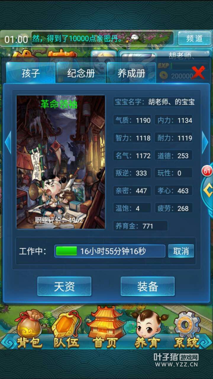 去黑市赚钱这是在减评价。 比如这个孩子成年了,现在还去做黑市小贩赚钱,赚来的养育金不够被扣掉的属性点,越养孩子越垃圾。所以我叫他赶快停止。 孩子成年后,如果还想加评价,那么就挑最接近1200的来培养,赚钱就用阴魂引路,减疲劳用野外,时间长了,就能提高评价。但这样加的评价不是很多,评价其实到了4950以上,亲密孝心双项400以上就挺好用了,有些朋友朋友追求完美,那肯定是评价越高越好。 本人从大话2测试开始玩到现在,也算是骨灰级玩家了,如果您喜欢交流或咨询大话2相关的,可以加我微信zny221005,我拉您进叶子猪微信群,叶子猪微信群一和群二都满500玩家,现在开启叶子猪微信群三有400多位玩家了,期待您的加入,大话2有您更精彩! 最后祝大家玩的开心,多得好东西,祝叶子猪网站越来越好! >>>战且试天下为叶子猪制作的工具:孩子评价天资计算器公布 带新手走出误区 <<<点击进入大话西游2论坛讨论>>> [编辑:米奈]