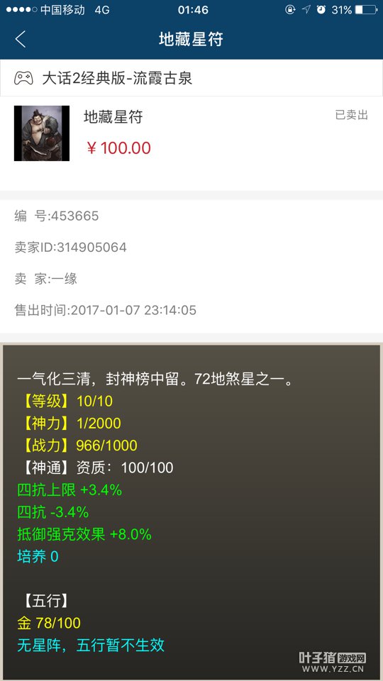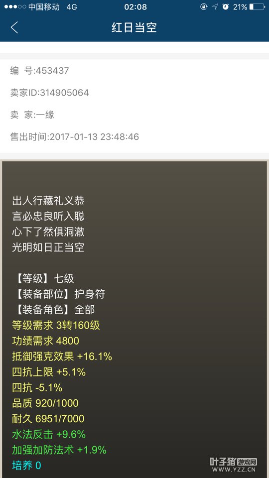剩下就是衣服的选择,自然是神兵五彩衣服,有钱用5级没钱用4级,价格自己去搜CBG! 关于鞋子,我选择人法BD,附加气血20%! 项链选择抗混或是冰,看你缺什么抗性啦,自然属性越高越好,什么+根骨+敏,抗仙法乱七八糟,越多越好 四抗抵御强克护身符 星卡花了600w集市淘的,护身符也是50块CBG点的,自己洗盘属性。 四抗加抵御强克