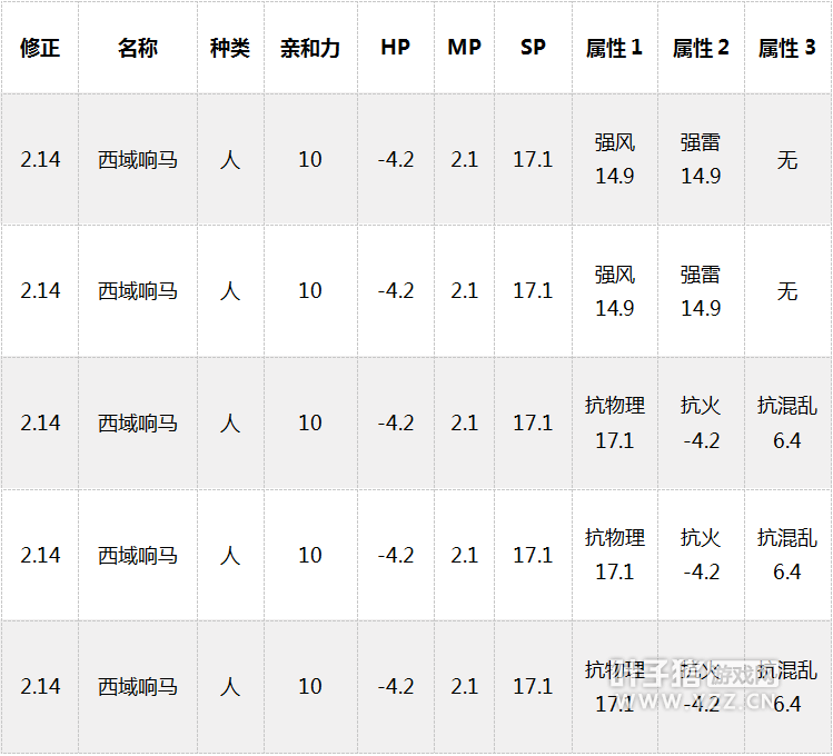 (4)一猴一冰二凤一西 建议搭配:男人、男仙、女仙、双魔 魔2000SP进战斗——2198、2278SP,有朋友是不是觉得这套卡除了便宜,没什么亮点? (PS:对啊,这组卡的亮点就是便宜#17) (5)五个西域响马 优点敏高,高克水推荐使用者为:3敏魔2仙,2魔2仙1敏男人,2魔1仙1人1鬼 2000SP进战斗——2576SP