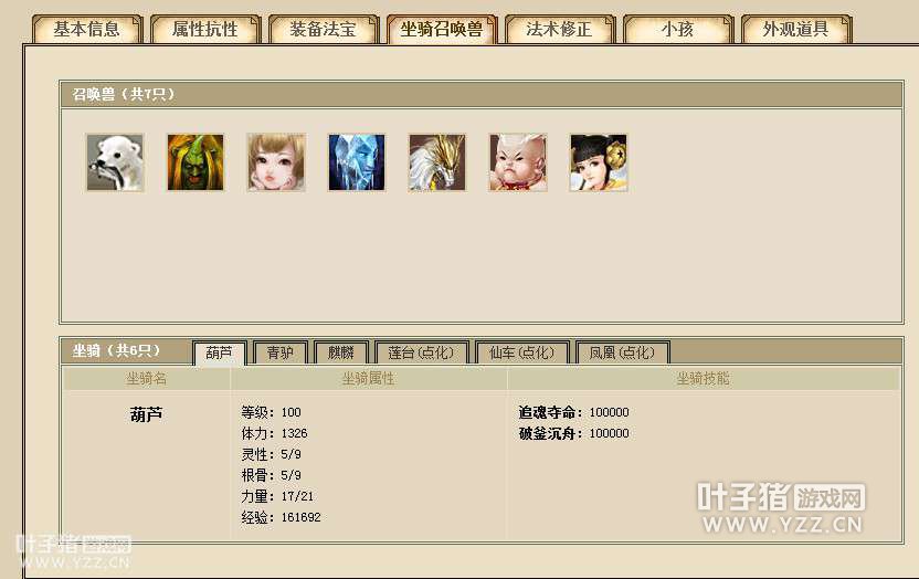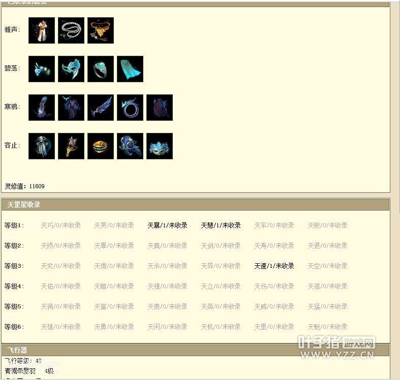 套装:一看此图套装少的可怜,但是根据1W+的灵修可以预测差不多的套装应该是有的只是没收录,这点来看如果相中这个号其他点的话,就要想办法联系下本人问下是否有自己想要的套装了。如果没有那后期自己刷又是虐心的过程,这点我觉得还是直接选择有自己想玩角色的套装肯定是必须的。 前面考虑好的想玩什么角色这里就要派上用场了,对应的角色对应的套装。灵修值也是一个重要的点,他决定你能多久,花多少钱来拥有一套传世套,一件传世基本保持在1800左右灵修,所以算数自己算,没传世从实战效果上还是有很大差距的。 天罡星:这个因人而异,能把天罡星积满的号估计几千块钱是拿不下的,天罡星能收录满的一般其余号的细节都不会很差。 飞行器:可以忽略。后期投入不是很大就能拥有一个5的。 召唤兽和坐骑