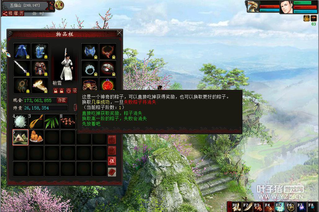四、奇粽连环 1.活动时间 2017年5月27日0:00-2017年5月30日23:59、2017年06月01日全天 2.参与条件 人物等级≥30级,时间宠≥10级 3.活动流程 粽子包括豆沙粽、红枣粽、板栗粽、蛋黄粽、鲜肉粽、八宝粽、水晶粽等共七种,对应奇粽连环一阶到七阶粽子。 其中豆沙粽是通过秘粽制作合成得到,其他粽子都是通过上一阶换取得到。(换取有一定几率成功,若失败则粽子消失) 若选择直接吃掉粽子,则可获得相应的奖励。 但如果选择换取高一阶的粽子,则有几率成功将粽子升级,但一旦失败,则粽子会消失。(只能按照升级前的等级获得经验奖励) 升级过程中的任何粽子都可选择直接吃掉,或是选择继续升级。(最高阶的水晶粽除外,只能直接吃掉)