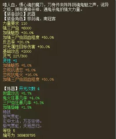 实战中,狂暴程度这个属性产生作用的前提是触发狂暴,若未能触发狂暴,则程度无作用,所以配程度的前提是有够高的狂暴几率; 谈回血,必须先谈回血的计算方式。 三尸技能五法本身的回血程度是140%,鬼族推出的时候就按140%来计算的,后来由于回血量低,比较鸡肋的问题,所以现在的计算方式是回血程度翻倍。 也就是说五法三尸现在的回血程度计算是280%,而且装备上的回血程度计算都是翻倍的。 最终回血值 = 三尸伤害 * 三尸回血程度 主回鬼,主流两种方案,平回和狂暴。 平回流: 平回的以神兵和仙器为代表,但从回血的较低来说,仙器的性价比低于神兵,所以一般我们见到的平回鬼多以神兵为主。 具体方案为以上的四级/五级双回神兵,配合强三尸数字的衣服帽子,双克的项链,强三尸数字的宝石,将三尸数字最大化,配合强力克,达到三尸伤害能带走水属性全敏召唤兽为标准。 配合神兵给予的高强三尸回血程度,回血量相当高。 以五级神兵为例: 武器+宝石+衣服+帽子,强三尸数字12000, 武器回血程度100,五法本身回血程度140,合计280,实际上回血程度为560% 星卡强力克50, 套装强力克40, 衣服帽子强力克40, 项链强力克50, 护身符强力克35, 宝石强力克35, 武器炼器强力克10; 合计:260。 可以看到:平回伤害67722,回血量56万+,接着来看!