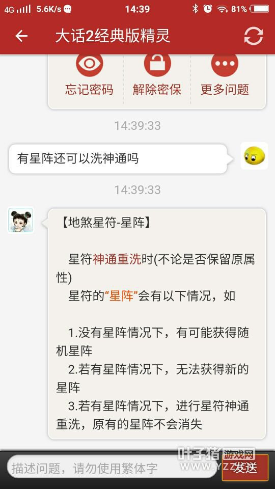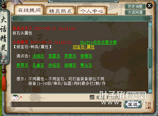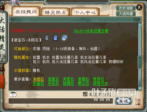 大家好!我是天若有情的战且试天下,今天给大家带来的是,游戏技巧分享。 前几天在叶子猪微信群聊里看到了几位大话玩家在说洗炼护身符的事情,有位朋友说可以用补天来洗,还有位朋友说用一级护身符来洗,他们都答对了,2种都可以洗,详见下图: 有些朋友是只知道用补天来洗,所以我想在这里科普一下,在我们区一级护身符就35万左右,补天收的话最少80万。肯定是用一级护身符加上5万费用也就40万左右,洗2次才是一个补天的钱,当然用护身符来洗合算。还有就是收一级护身符时留个心眼,有些黄字或绿色属性好的还可以卖大价钱呢。只要你留心,到处都是钱。 说到护身符,顺便介绍下叶子猪官网上的护身符属性计算器,打开叶子猪新大话2网站http://xy2.yzz.cn,如果手机访问的要拉到最下面,选电脑版才可以在左上角查看到。只要输入资质,所有属性都会出来。这个是我编写的,我原来是用软件编写,要下载电脑上才能用,不方便广大玩家使用。所以提供公式和数据给叶子猪技术员改成网页版,方便大家使用,详见下面2个图。 关于新石头属性的问题,前几天有个网友微信上问我,说能打在衣服和帽子的是什么石头,还有个网友在微信群里报怨新石头怎么洗都没有洗出忽视抽的石头,后面有人和他说没有忽视抽的属性,他说幸好问了。不然一直洗还是不出。由于新石头种类多,我还真记不住哪些石头能打衣服和帽子,我就打开大话精灵问了截图给他。还有就是出什么属性。其实这个不用记,只要在大话精灵那输入新石头属性,就可以点击每一项石头,都有对应的属性。详见下图: 关于星阵洗炼问题,很多人通过微信问我这个问题,就是有星阵了还能不能洗神通。这个是可以的,放心的洗吧!然后有人问,如果再洗出星阵是不是直接替换掉原来的星阵,其实这个问题我也担心过,所以我以前特地咨询过GM,GM给出的答复是,假如有星阵的是不可以再洗出星阵。这次我是用将军令里的游戏精灵。这个挺方便的,打开手机将军令,点游戏助手,点游戏精灵,输入问题,就可以和游戏里的大话精灵一样。详见下面的截图: 本人从大话2测试开始玩到现在,也算是骨灰级玩家了,如果您喜欢交流或咨询大话22相关的,可以加我微信zny221005,我拉您进叶子猪微信交流群,期待您的加入,大话2有您更精彩! 最后祝大家玩的开心,多得好东西,祝叶子猪网站越来越好! <<<点击进入大话西游2论坛讨论>>> [编辑:wei]