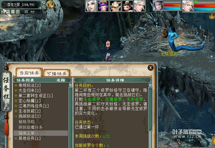 全新副本玩法混沌之冢撼来袭!混沌幻境、混沌之冢,修罗密藏等多种玩法,奖励也是比较丰富的哦。 混沌之家周常任务 此任务有简单和困难两种模式,每周可选择任意难度完成两次任务。 简单难度的任务领取人:骨冢使者(修罗古城,38,244) 困难难度的任务领取人:镜海使者(修罗古城,40,244) 困难难度下会多一段镜海水域,需要玩家齐心同力划船过去,再进入混沌之冢。此难度下任务难度会加大,同时修罗令和人物经验也会多一些。 镜海水域 仅困难模式下才会触发。 在镜海使者处选择“我们要从镜海进入”,开始通过这一段镜海水域。 骨冢之路 进入混沌之冢后,需走过一段“骨冢之路”,请多加小心路上神出鬼没的游魂。 走到任务地点后,通过神秘漩涡可进入第一环。 第一环 由转烛、飘蓬、流沙三个修罗把守。 挑战胜利后出现神秘漩涡,通过神秘漩涡可进入下一环。 第二环 由无名修罗、无情修罗、无形修罗三个修罗把守。 战胜这3个修罗后,出现守关修罗:无定修罗。 需要注意的是:对无名、无情、无形修罗的战斗顺序不同,会导致无定修罗的实力也不同。 挑战无定修罗胜利后出现神秘漩涡,通过神秘漩涡可进入下一环。 第三环 由无生无死、非生非死两个修罗把守。 找到无生无死后,开启“寻找魂魄”任务,任务通过后即可挑战非生非死。 非生非死: 完成超度亡魂任务后,挑战“非生非死”胜利出现神秘漩涡,通过神秘漩涡可进入下一环。 第四环 由“无常修罗”把守。 挑战胜利后出现神秘漩涡,通过神秘漩涡可进入下一环。 第五环 由“穷奇分身”把守。 温馨提示:一定要先打败穷奇分身,再趁势封印住它,才算通过本环。若此过程不完整,请出去后重新挑战本环任务 副本奖 修罗令和人物经验