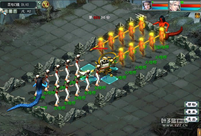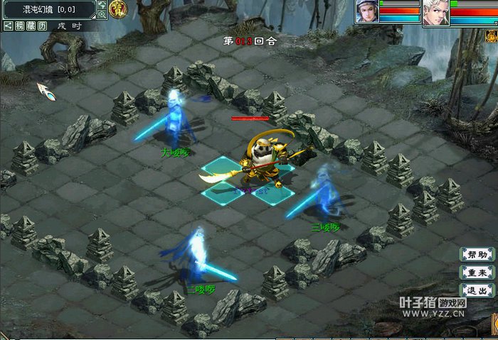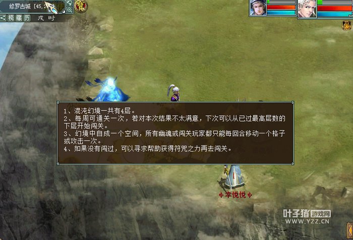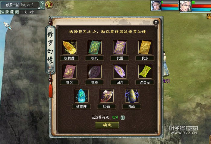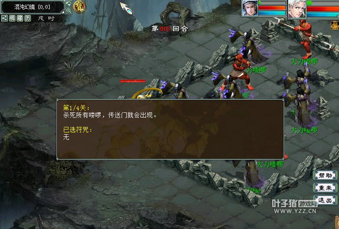 混沌幻境单人玩法 修罗古城(44,226) 幻境使者 符咒之力 初始可选择1个符咒之力,之后每20次修罗可多选择1个符咒之力,最多选择7种符咒主力。一周内都有效。 第一关 杀死所有喽啰后,场景中会出现一个传送门,走到传送门可进入下一关。 第二关 这关需要在18回合内杀掉所有喽啰。 第三关