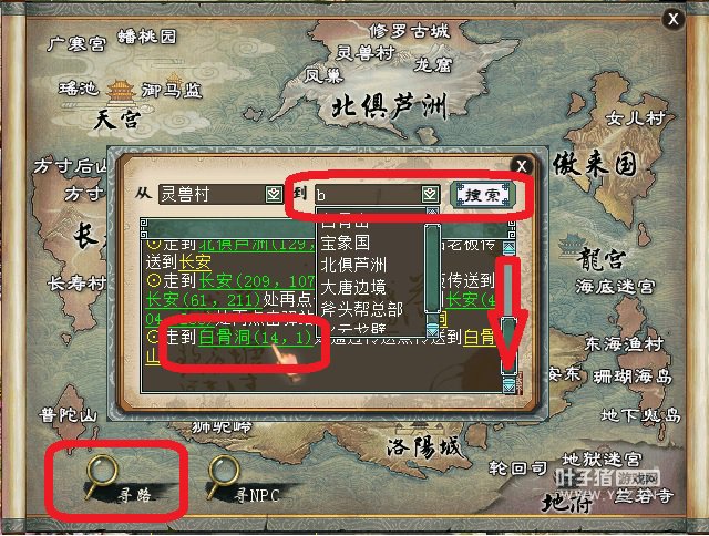 最近有好几个微信上的大话玩家问我自动寻路的问题,用文字描述效率比较低,所以现在用图文的方式,帮助不了解自动寻路的玩家快速掌握,多得盒子多得神兵。 按ALT+2会出来一个大的地图,我们点击左下角的寻路,就会出来寻路的框,只要输入您要寻路的位置,这里是支持拼音首字母小写的和数字查询,比如白骨山您只要输入一下b就行,比如塔或龙或凤这些第几层就输入对应的数字就可以了。然后选中您要去的地方,点搜索,拉到最下面,点绿字,就会自动寻路到最近的地方。详见下图: 自动寻路界面
