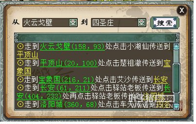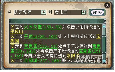 域外的自动寻路是火云戈壁到女儿国,那样域外要用到的地图都可以达到,详见下图: 域外寻路火云到女儿国