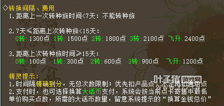 按照大话目前两周开一个新服的频率,仍旧很多小伙伴跑去新区玩,有的是为了感受下作为新人的快感,有的是阔别许久的老玩家回归,游戏更新节奏较快的缘故,故网上一些玩家对现在冲新区及一些游戏常识不是很清楚。 今天柒柒就分享下在新区的玩法:(个人见解,虚心听取各位的意见) 游戏四个种族,人魔鬼仙,可以根据你的喜好选择你喜欢的角色,但是转生记得一定要选择男魔修正,现在3世男魔修正的号实在太吃香了。 换种族是到皇宫找黄大仙进行转换,两次转种族之间不能小于7天 转种族费用说明