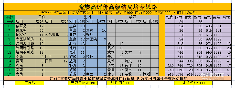 大家好,我是来自月光爱人的″墨染初荷ミ,今天我给大家带来的是养育系统的魔族孩子结局选择。 此贴为个人看法仅供大家参照,如有错误的地方,请大家指正 关于魔族孩子,根据用途来选择。 一、日常选择 高级结局——女侠客/大内第一高手 此类适合于大力族、主抽敏魔族。天资的选择主要为:破甲、嗜血、金刚或者震慑强化、摄气诀、金刚/龙神。 优势很明显因为高级结局强化魔族天资只有两种,1/2的几率强化起来比较容易,高级通用天资稍花费功夫。 二、PVP选择 神结局 此类适合于主天资为:先发制人、龙腾、金刚/龙神或者各种仙法甲、冥火甲、金刚/龙神这类的针对天资。 此处,不在介绍神结局的培养方法。 这里我们只研究魔族高级结局——女侠客。可能有朋友会有疑问,为什么不写男孩子大内第一高手呢。 大家可以先看一下两种孩子的结局条件: 女侠客(女) 结局达成条件:耐力最高 耐力≥999 内力≥999 名气≥999 (做打手30次) 大内第一高手(男) 结局达成条件:耐力最高 耐力≥999 内力≥999 名气≥999 (御膳房火工30次) 不难看出此结局,女孩子优于男孩子,女孩子结局条件打手190金/次胜过男孩子结局条件御膳房火工30金/次。 进入正题 第一阶段 孩子出生吃(百年茯苓)12本,因为孩子后期学习有减气质跟智力的地方所以建议吃百年茯苓。 孩子到了6岁的时候养育金是2160。 第二阶段 6岁开始: 工作---做家务,(学习到疲劳到300)每次约给22点叛逆、10点养育金和18点疲劳。(约17次) 生活---皇宫,(学习到7岁,疲劳300以上是可以生活皇宫的),名气消耗120的养育金,获得24点名气,不加疲劳。(约19次) 7岁开始:(海边解锁) 生活---海边,(开始减疲劳),之所以7岁开始-疲劳,是因为7岁海边比6岁减疲劳的地方多4点。这也是前期学习叛逆和名气的原因,现在养育金几乎没有了,去海边减疲劳一次完了一直做家务疲劳满,再海边一次继续做家务,如此反复。 工作---做家务,(继续加叛逆和养育金),钱够120就去皇宫。 备注:能工作跟皇宫(养育金够120)的时候千万别去生活减疲劳 8岁开始:(野外解锁) 生活---野外(减疲劳),继续像7岁那样野外减疲劳 工作1---做家务,(继续加叛逆和养育金),钱够120就去皇宫,把叛逆养到1100以上,禁止到1200。 工作2---驿站收银,(叛逆到达1100以上方可驿站收银),赚更多的养育金,此时生活去野外,工作去驿站,养育金120去皇宫学习名气到9岁。 备注:能工作跟皇宫(养育金够120)的时候千万别去生活减疲劳 9岁开始:(穿上道德大于等于50的装备太医院解锁) 生活---太医院,(减疲劳) 工作---太医院煎药(加养育金),钱够120去皇宫涨名气,三点一线的生活,到10岁。(名气到1000左右,后面可以补充) 备注:能工作跟皇宫(养育金够120)的时候千万别去生活减疲劳 10岁开始:(地府、阴魂引路解锁) 生活---地府,(减疲劳) 工作---阴魂引路,阴魂引路开启的条件是名气跟气质都大于70,穿上装备使气质到70去地府生活一次使阴魂引路解锁。现在开始生活去地府、工作去阴魂引路。 学习---武术,现在开始地府、阴魂引路、学习武术。三点一线的生活了,这样一直学习下去。 11岁开始:没有开新的地图,所以继续10岁的操作。 12岁开始:(解锁黑市、黑市小贩) 生活---黑市,这里会减属性但是给相应的玩性。 工作---阴魂引路,不要去黑市小贩,因为减属性太多。 学习---武术,现在开始就是生活去黑市、工作去阴魂引路、学习去武术(30次改学美术约7次)。 备注:进入13岁前尽量把养育金花光,疲劳到最大。。 13岁:打手,旅游。 生活---赌场(1次),解锁打手工作。注意:只需要去一次赌场解锁打手工作即可,再减疲劳就旅游 工作---打手(约13次),这里会减智力和气质,前面我们没有学习这些。注意:只需要去一次赌场解锁打手工作即可 学习---美术(约20次)。 14岁:打手,旅游。 进入14岁需要注意的是,先工作和旅游,在打手次数不满30次的时候尽量不要去学习诗文。(学习的话可以先学习够30次美术) 工作---打手(约17次) 学习---美术学习够30次后,再学诗文。 15岁后:卖萌,旅游。 学习---诗文学够30次,音律30次,接下来学习骑术,建筑,舞蹈,宗教。 17岁是关键:如果前面名气不够的话要适当补充名气属性,并准备好装备,结局之前最后一次行动力穿好装备时候要要保证耐力的属性最高,名气和内力两项次之,但都需要≥999点,名气和内力不能和内力属性一致!!!否则会变成隐藏结局。 最后的重点:结局 结局前的准备工作:检查各项属性是否超标。千万要检查。不然成隐藏结局就哭了。 耐力最高(可以适当穿主耐力的装备,但是看好名气,内力,叛逆不能超过或者等于耐力属性,我这里之所以没有将智力、气质上到999以上,当然小伙伴可以稍作调整,将智力或者气质提升至999以上,但是注意不要超过或者等于耐力属性。) 结局后洗玩性,这个不用我解释吧。差不多洗完玩性评价约4900以上。 缺点很明显,因为占用打工次数,学习的次数自然而然就减少。属性后期要花费大功夫来补充,毕竟鱼与熊掌不可兼得。 后期的工作就是强化天资和补充属性。打工的话选择阴魂引路。结局后做家务不减属性。 附大致思路图: [编辑:一笑奈何]