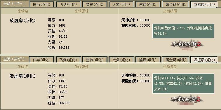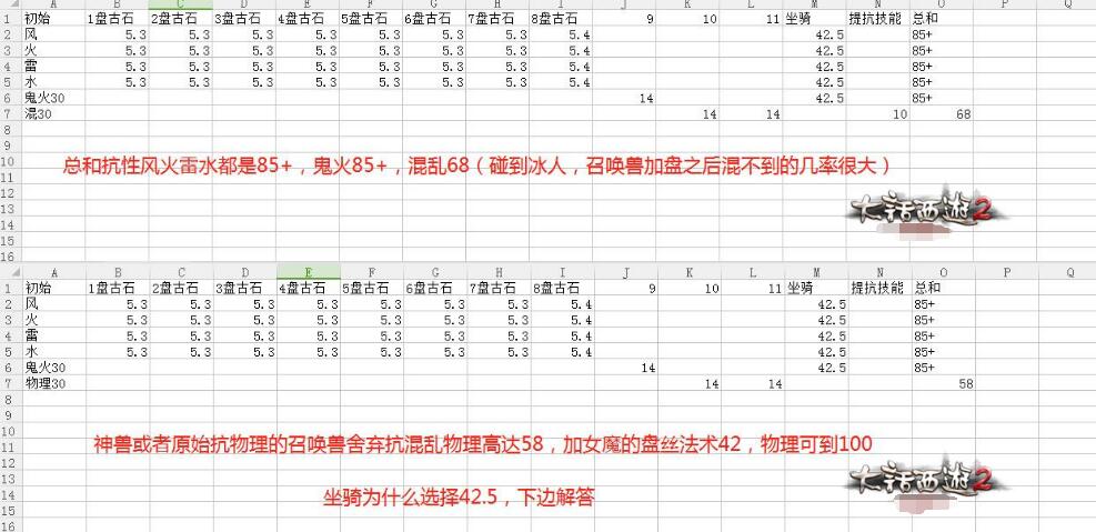 大家都知道仙族都是带不死召唤兽,所谓不死召唤兽,就是指仙族血多高抗站桩的召唤兽,平民玩家用的拨浪鼓一类的,土豪用的明察,神兽甚至是明察神兽 打造方法: 炼妖篇:两种方案(盘古石不一定都是5以上的我们可以把8块盘古石的每种抗性相加总数超过42.5就好,为什么是42.5下边我们会说) 坐骑篇:我们先看人族点化7坐骑满筋骨、满等级、满熟练的属性,抵御强力克24.5(图片来自藏宝阁) 我们再看召唤兽装备,抵御克总数42(这里我们选择6级满品质满通灵的,小伙伴们请把抵御克都看作是抵御克水):