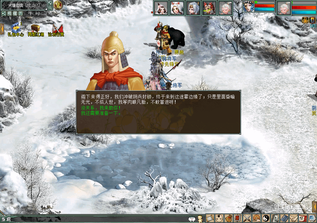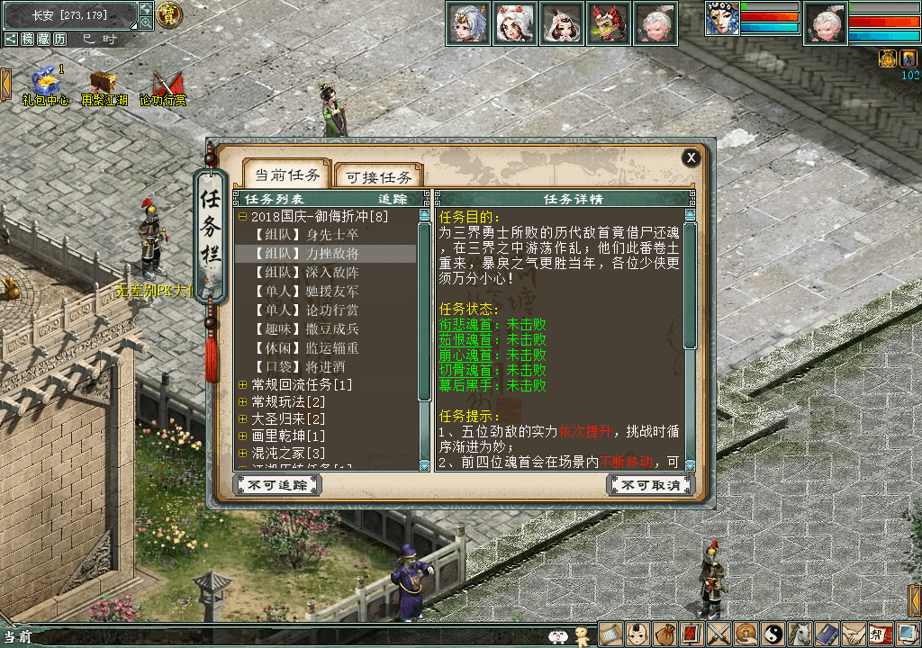 温馨提示:所获战功可用于提升军衔,裨益良多。 活动奖励 【深入敌阵·组队】 活动内容 活动背景 幕后黑手在大唐边疆之地布下法阵,以怨念催动阴兵不眠不休地侵扰边境。 幸得高人指点,少侠可前往法阵之内,击败四方护法便可延缓敌军攻势。 活动时间 2018年10月1日0点至2018年10月7日24点 参与条件 人物等级≥30级,时间宠等级≥10级 活动场景 大唐边境、幽影迷境 活动流程 勇闯法阵 3-5人组队,经由 大唐边境(82,271)处的 大唐先锋官,进入四位护法所在之地。 四位护法性情迥异,要想通过他们的考验,须仔细聆听他们的提示,按照他们的规则行事。 温馨提示:四位护法的考验没有强弱之分,可以按照任意顺序进行挑战。