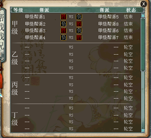 如上图所示,获得跨服帮战资格的帮派为, 甲级帮派1、甲级帮派8、甲级帮派3、甲级帮派7。 若跨服帮战期间遇到限制移民和跨服的情况,当周跨服帮战暂停,进行本服帮战。 跨服帮战两周为一轮次,2场跨服帮战结束后,将进行跨服帮战积分排名。 赛季结束后,将重置帮派的跨服帮战积分。 参与条件 帮战暂停,进行本服帮战。 跨服帮战两周为一轮次,2场跨服帮战结束后,将进行跨服帮战积分排名。 赛季结束后,将重置帮派的跨服帮战积分。 满足以下全部条件的帮派,赛季双周周六2场比赛自动转换为跨服帮战: a.服务器开服时间>6个月 b.赛季双周周五甲级帮战获得胜利 参与跨服帮战的帮派,本服帮战威望值按上周名次排序获得,例参与跨服帮战的A、B、C、D4个帮派的上周本服帮战的名次为1、2、6(在与第3名的帮战中获胜)、4,威望值的分值排序应为A排第1、B排第2、D排第3、C排第四。其余未参与跨服帮战的帮派在本服匹配帮派对战,不受跨服帮战影响,获得的帮战名次与本服帮战规则一致。 跨服赛制